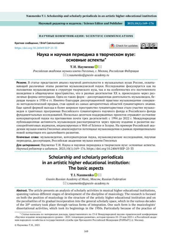 В статье представлен анализ научной деятельности в музыкальных вузах России, охватывающий различные этапы развития музыковедческой науки. Исследование фокусируется как на положении музыковедения в структуре творческого вуза, так и на особенностях его постепенного вхождения в общенаучное пространство, что в разные десятилетия XX в. происходило через различные формы интеграции. Одна из таких форм – диссертационная деятельность музыковедов, берущая начало в 1930-е гг. Именно благодаря диссертационной практике музыковедение совершило методологический прорыв, став одной из самых авторитетных областей гуманитарного знания. Еще одной формой выхода в более широкое пространство гуманитаристики стало участие музыковедов в грантовых программах Российского гуманитарного научного фонда и Российского фонда фундаментальных исследований. Несколько десятков поддержанных проектов отражают состояние консерваторской науки на протяжении почти трех десятилетий: с 1994 до 2022 г. Международная публикационная активность музыковедов рассматривается через призму издания и развития высокорейтинговых журналов, индексируемых в Web of Science и Scopus. На примере Российской академии музыки имени Гнесиных анализируется потенциал музыковедения в рамках принципиально новой концепции его дальнейшего развития.