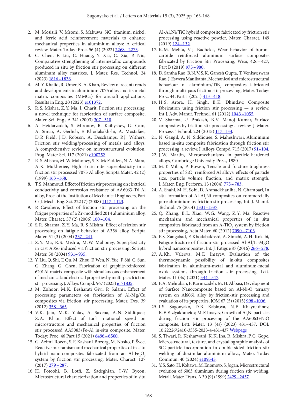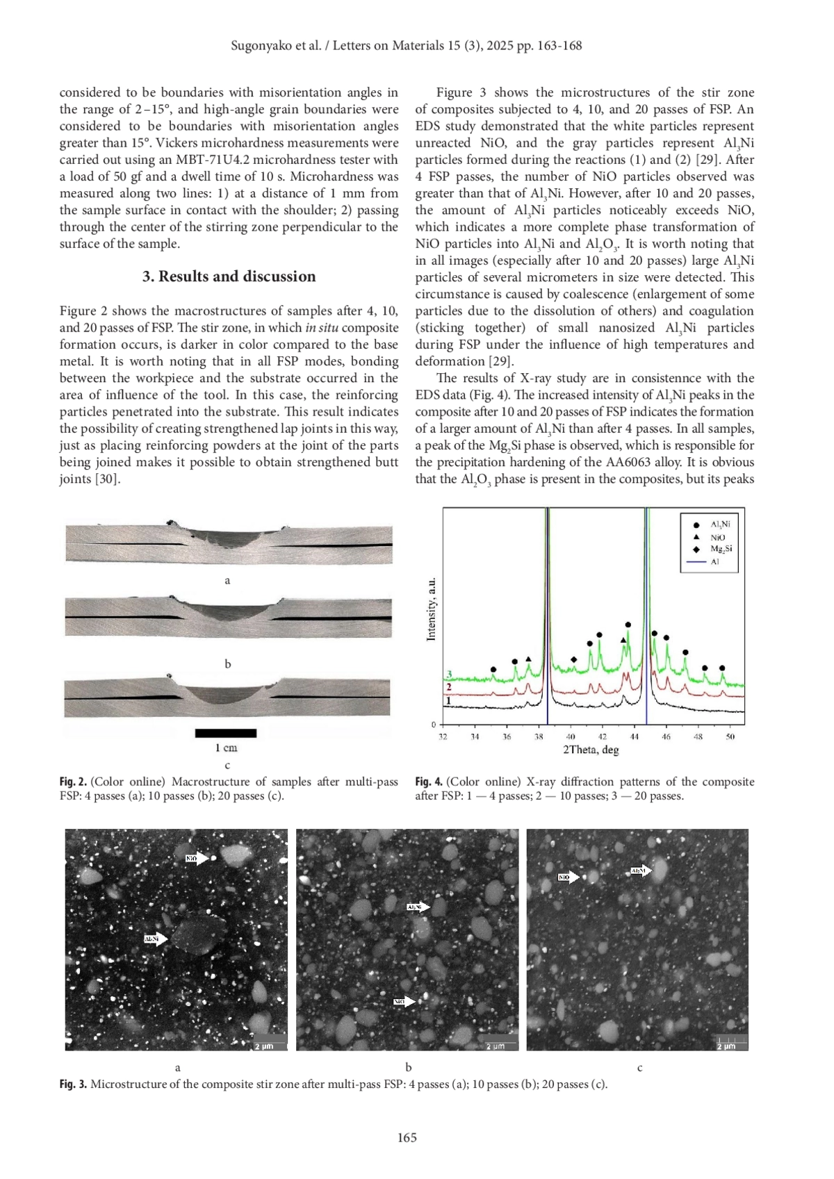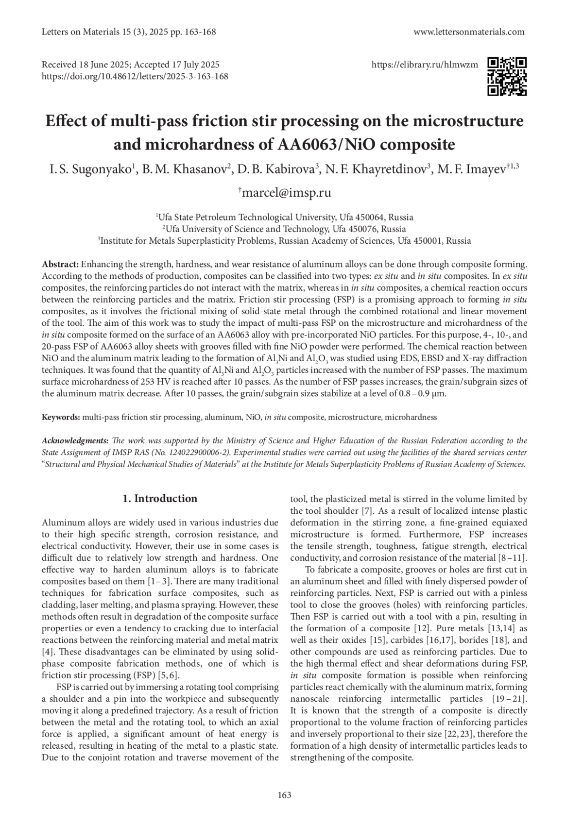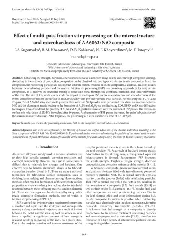 СУГОНЯКО И. С., ХАСАНОВ Б. М., КАБИРОВА Д. Б., ХАЙРЕТДИНОВ Н. Ф., ИМАЕВ М. Ф. EFFECT OF MULTI-PASS FRICTION STIR PROCESSING ON THE MICROSTRUCTURE AND MICROHARDNESS OF AA6063 / NIO COMPOSITE // ПИСЬМА О МАТЕРИАЛАХ. 2025. № 3 (59), ТОМ 15