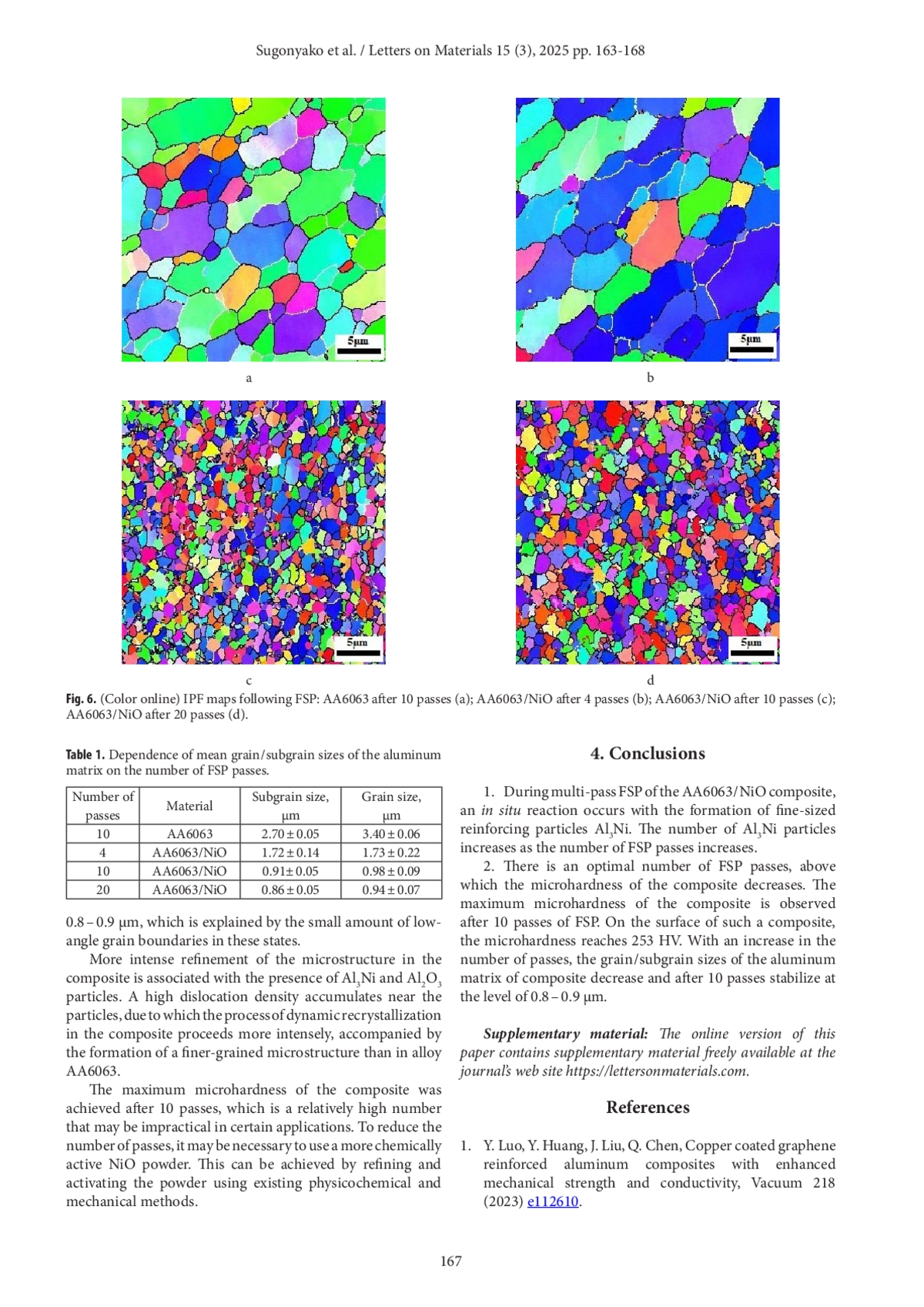 Статья: Effect of multi-pass friction stir processing on the microstructure and microhardness of AA6063 / NiO composite (2025)