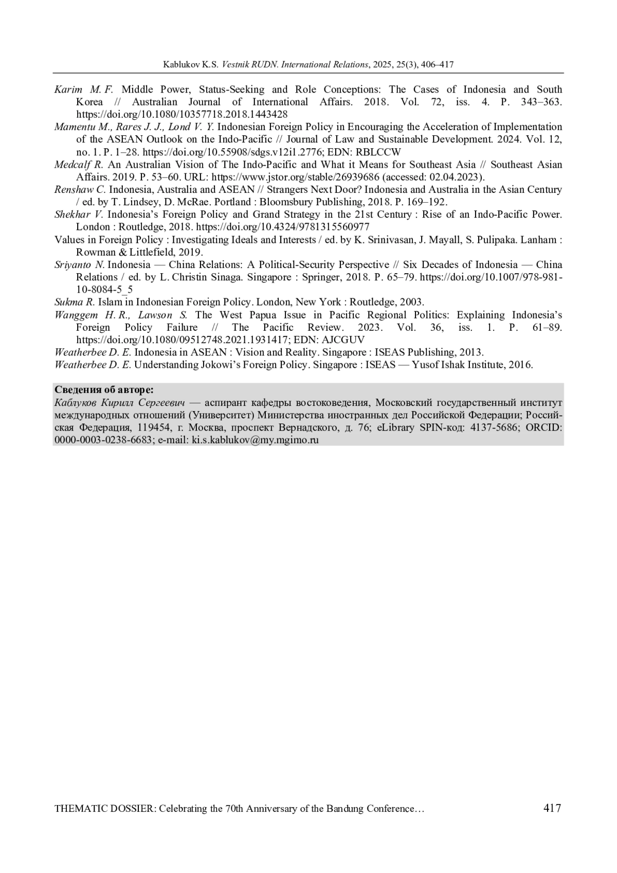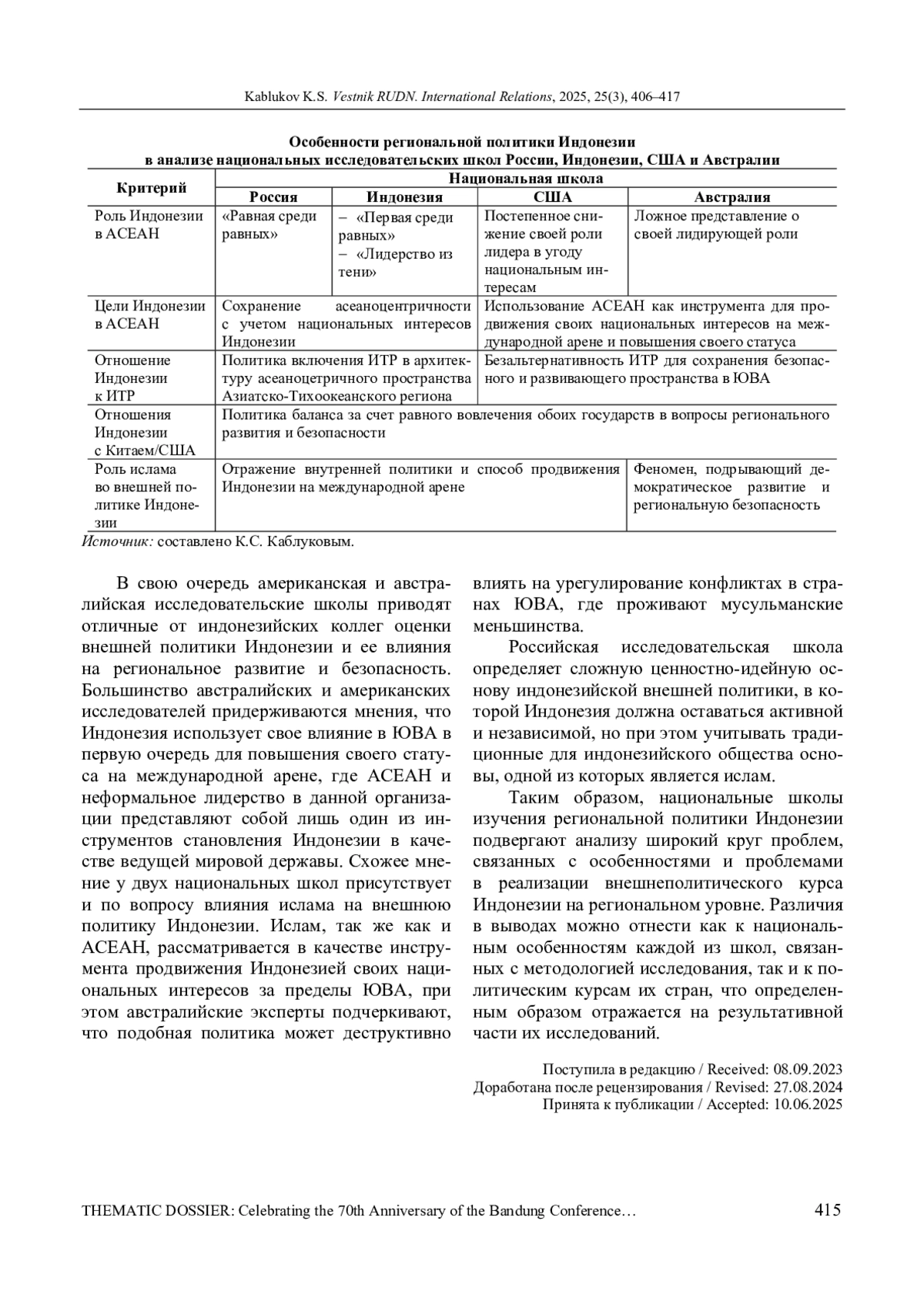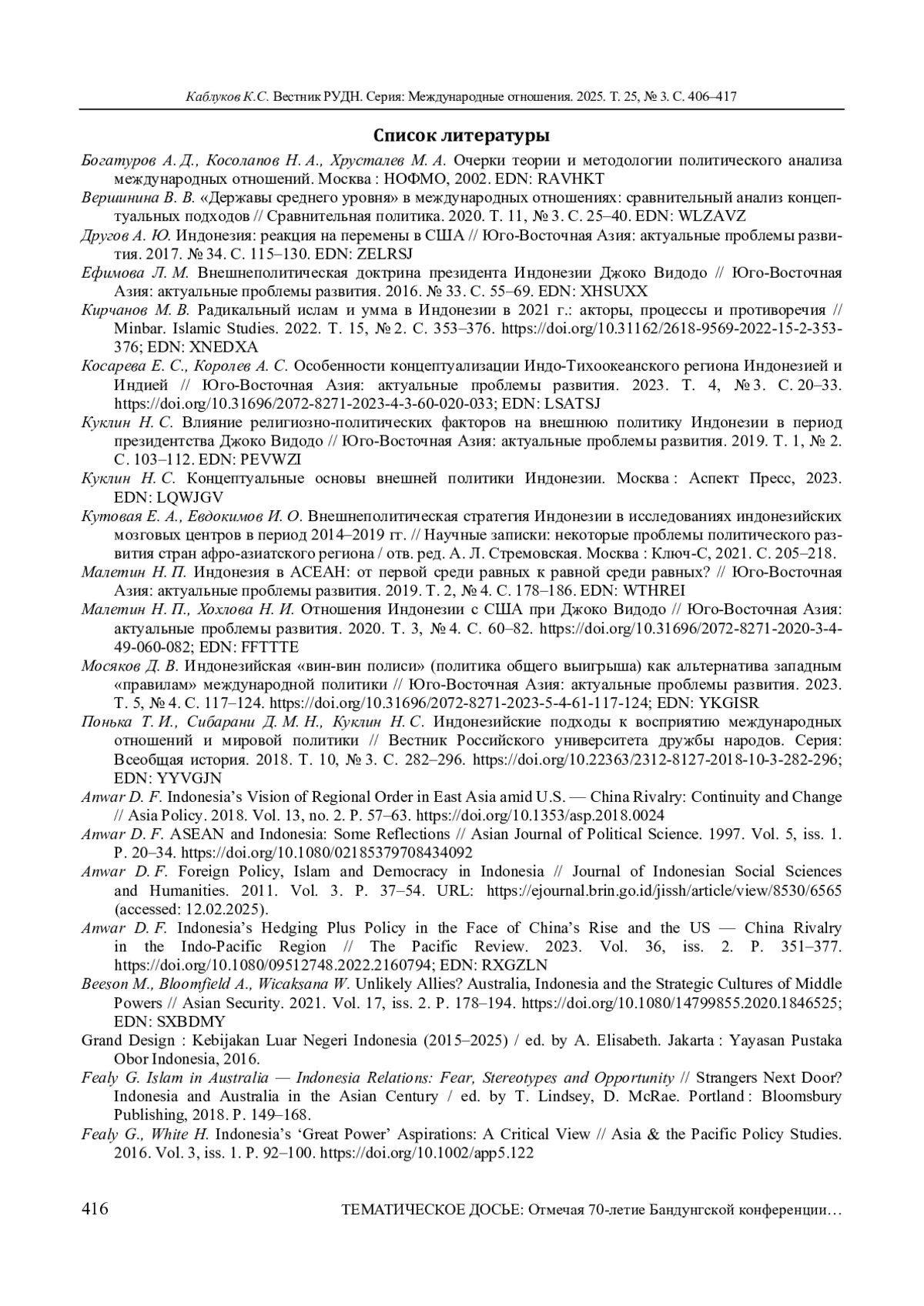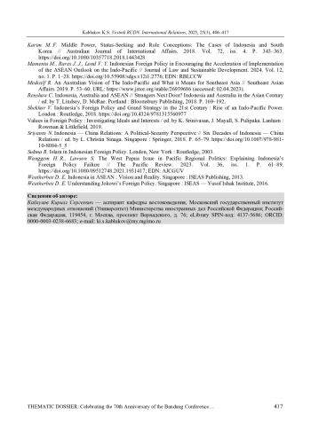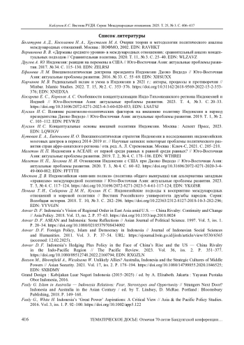 КАБЛУКОВ К. С. РЕГИОНАЛЬНАЯ ПОЛИТИКА ИНДОНЕЗИИ В ФОКУСЕ НАЦИОНАЛЬНЫХ ИССЛЕДОВАТЕЛЬСКИХ ШКОЛ: СРАВНИТЕЛЬНЫЙ АНАЛИЗ // ВЕСТНИК РОССИЙСКОГО УНИВЕРСИТЕТА ДРУЖБЫ НАРОДОВ. СЕРИЯ: МЕЖДУНАРОДНЫЕ ОТНОШЕНИЯ. 2025. ТОМ 25 № 3