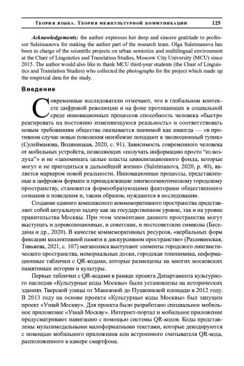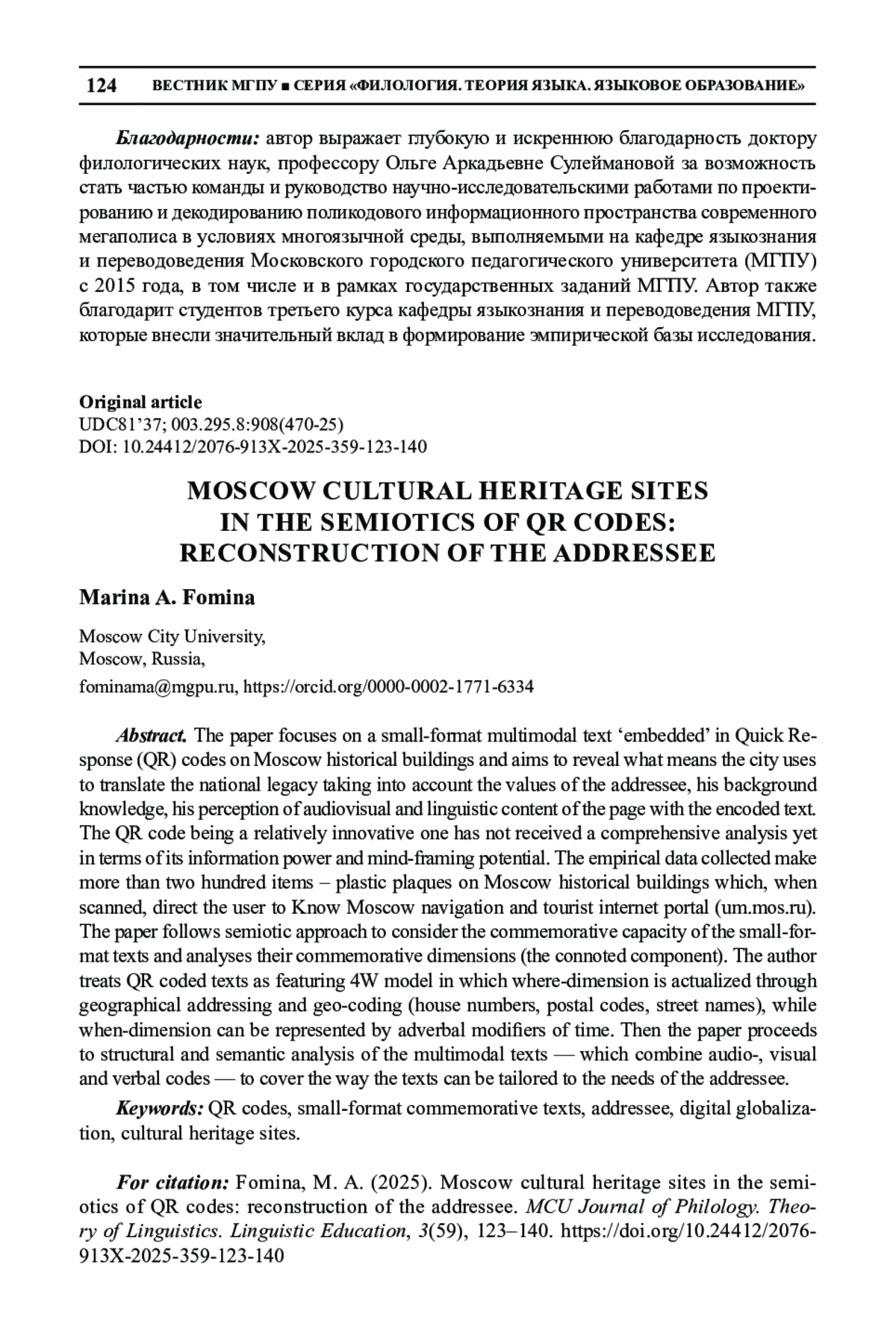 В статье обобщены результаты анализа содержания малоформатных полимодальных текстов, ссылки на которые закодированы в QR-коды, расположенные на объектах культурного наследия Москвы. Несмотря на то что в современном мире QR-коды имеют невероятно широкую область применения, QR-технология все еще является относительно новой, а ее потенциал с точки зрения активизации познавательного процесса, формирования сознания и трансляции базовых идеологических установок и ценностей, информации о культурном наследии города до сих пор не становился объектом специальных исследований, что обусловливает актуальность настоящей публикации. В работе ставится задача выявить основные средства трансляции информации о культурном наследии города с учетом ценностей адресата, предполагаемых у него фоновых знаний, его особенностей восприятия аудиовизуального и лингвистического контента страницы с закодированным текстом. Материалом исследования стали более 200 табличек с указанием названия объекта культурного наследия и QR-кода позволяющего при сканировании пройти на соответствующую страницу интернет-портала «Узнай Москву» (um. mos. ru). Автором проводится анализ малоформатного коммеморативного текста с позиций семиотического подхода. Устанавливаются особенности структуры текстов в соответствии с четырехмерной моделью локализации описываемых исторических/культурных событий, связанных с объектом культурного наследия. При этом физические пространственные характеристики реализуются через указание номеров домов, названий улиц и пр. (для определения геопозиции объекта культурного наследия), тогда как временные характеристики актуализируются при помощи языковых структур, выполняющих функцию обстоятельства времени. Проведенный контент-анализ позволил выявить структурные и семантические особенности анализируемых полимодальных текстов с учетом соотношения в них вербальных и невербальных элементов, а также сформулировать некоторые предложения относительно концепции их содержания с учетом фактора адресата.