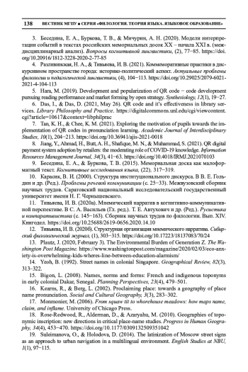 19. Suleimanova, O., & Holodova, D. (2014). The latinization of Moscow street signs as an approach to urban navigation in a multilingual environment. English Studies at NBU, 1(1), 97-115.