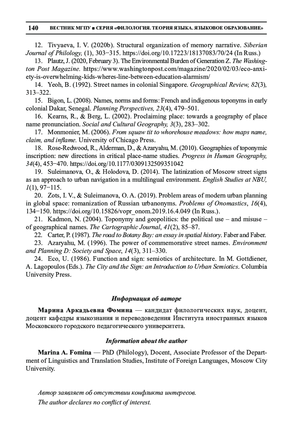 20. Зоц, И. В., & Сулейманова, О. А. (2019). Проблемные “зоны” современной урбанистики в глобальном пространстве: транслитерация урбанонимов. Вопросы ономастики, 16(4), 134-150. DOI: 10.15826/vopr_onom.2019.16A049 EDN: PNMWDP