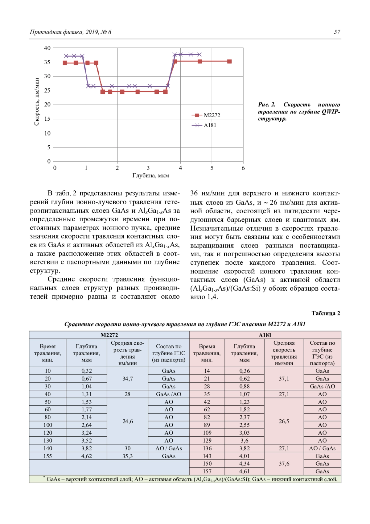 В работе исследованы зависимости скорости ионно-лучевого травления верхнего контактного слоя (GaAs: Si), активной области, состоящей из пятидесятикратного чередования барьерных слоев (AlxGa1-xAs) и квантовых ям (GaAs: Si), нижнего контактного слоя (GaAs: Si) по глубине QWIP-структур на основе GaAs-AlGaAs, изготовленных методом молекулярно-лучевой эпитаксии (МЛЭ), с целью определения влияния состава различных слоев на скорость травления и возможности завершения процесса травления на необходимую глубину по времени.