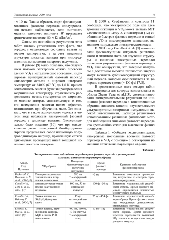 Обнаружение сверхбыстрого обратимого фазового перехода в тонких пленках диоксида ванадия, инициируемого короткими лазерными импульсами высокой интенсивности подтверждено многочисленными экспериментами, выполненными в ведущих физических лабораториях. Сверхбыстрый обратимый фазовый переход может быть инициирован также короткими рентгеновскими импульсами, электронной бомбардировкой образца и импульсным электрическим полем высокой напряженности. Сверхбыстрые, со временем порядка 10-13 с, фотоиндуцированные фазовые пере- ходы в новое кристаллическое или аморфное состояние экспериментально наблюдались также в Si и GaAs [23]. Уникальное сочетание сверхвысокого быстродействия, чрезвычайно широкого диапазона изменения электрических и оптических параметров, тонкопленочная (близкая полупроводниковой) технология и работа при комнатной температуре создают реальные предпосылки для создания оптических затворов с рекордным быстродействием для исследования быстропротекающих процессов и принципиально новых логических устройств и устройств памяти. Оптические затворы с временем переключения порядка 10 фс создают принципиально новые возможности в спектроскопии комбинационного рас-сеяния и терагерцовой спектроскопии реального времени. Интеграция оптики и электроники считается следующим шагом в эволюции информационных и коммуникационных технологий. Intel, Hewlett-Packard и IBM в течение последних пяти лет создают чипы с повышенной оптической функциональностью, которые работают на гигагерцовых скоростях, что в тысячу раз меньше, чем у VO2-коммутатора.