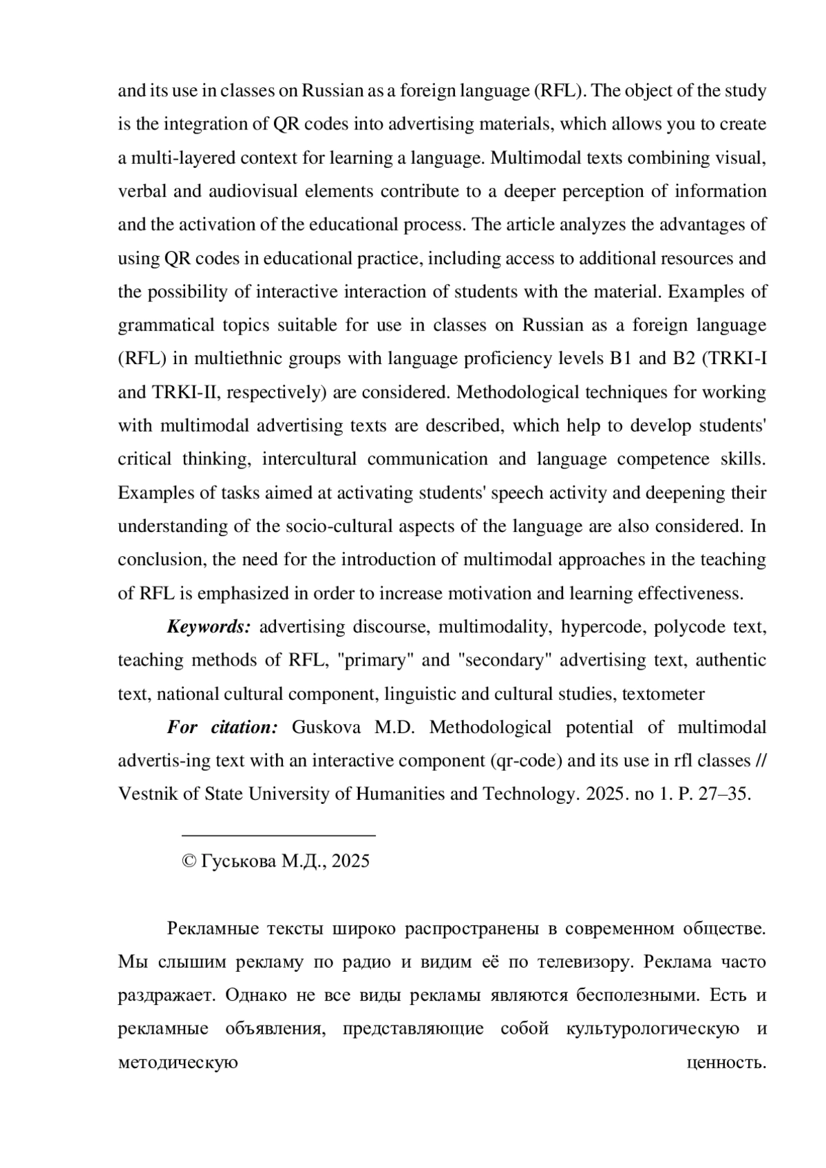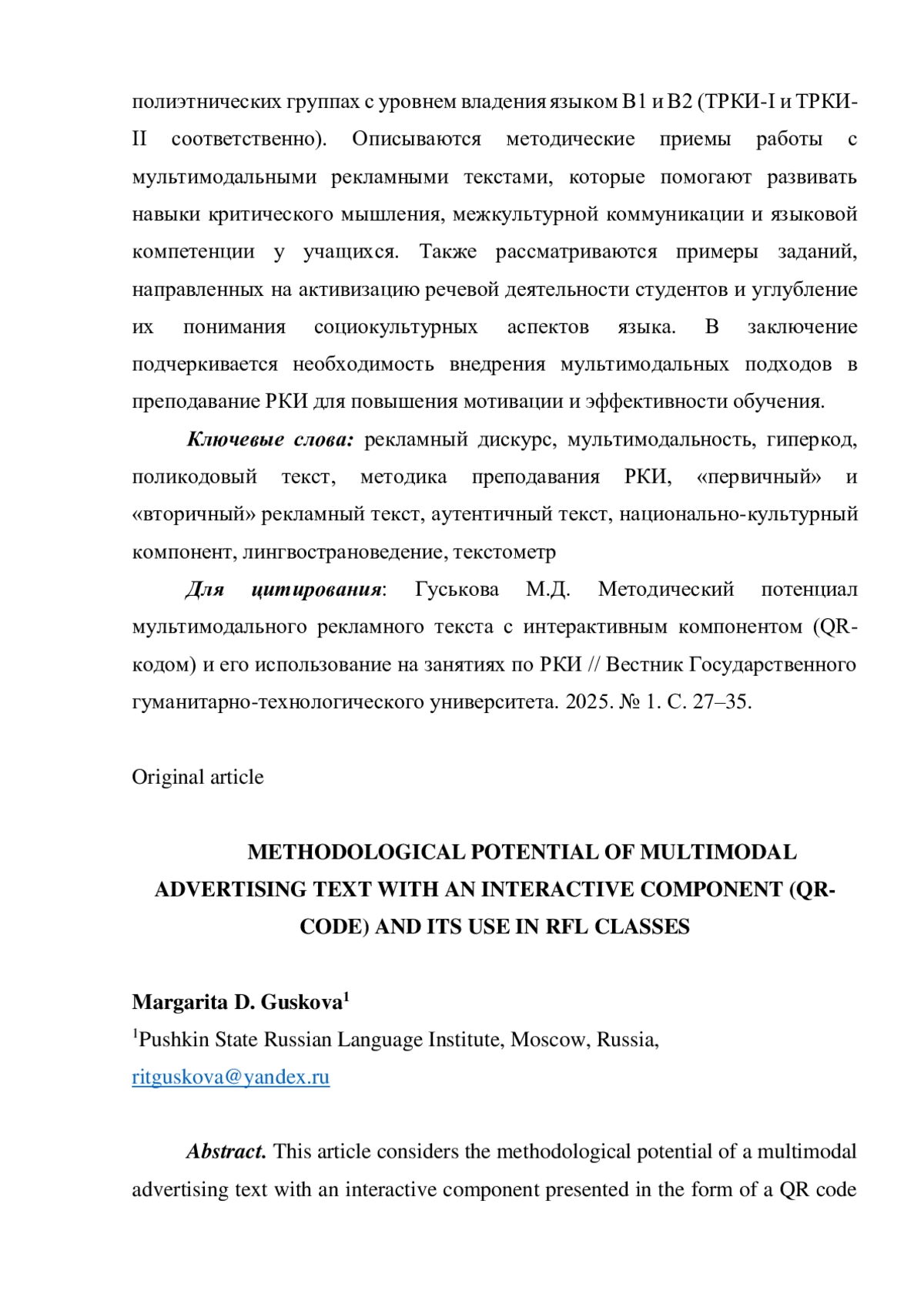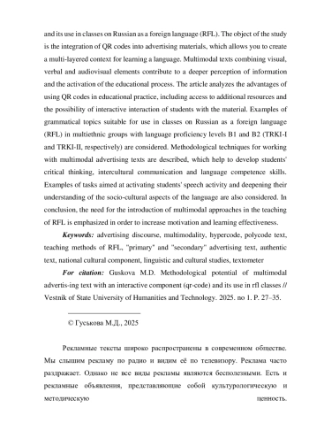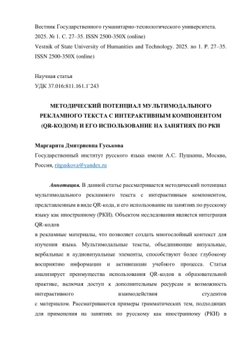 В данной статье рассматривается методический потенциал мультимодального рекламного текста с интерактивным компонентом, представленным в виде QR-кода, и его использование на занятиях по русскому языку как иностранному (РКИ). Объектом исследования является интеграция QR-кодов в рекламные материалы, что позволяет создать многослойный контекст для изучения языка. Мультимодальные тексты, объединяющие визуальные, вербальные и аудиовизуальные элементы, способствуют более глубокому восприятию информации и активизации учебного процесса. Статья анализирует преимущества использования QR-кодов в образовательной практике, включая доступ к дополнительным ресурсам и возможность интерактивного взаимодействия студентов с материалом. Рассматриваются примеры грамматических тем, подходящих для применения на занятиях по русскому как иностранному (РКИ) в полиэтнических группах с уровнем владения языком B1 и B2 (ТРКИ-I и ТРКИ-II соответственно). Описываются методические приемы работы с мультимодальными рекламными текстами, которые помогают развивать навыки критического мышления, межкультурной коммуникации и языковой компетенции у учащихся. Также рассматриваются примеры заданий, направленных на активизацию речевой деятельности студентов и углубление их понимания социокультурных аспектов языка. В заключение подчеркивается необходимость внедрения мультимодальных подходов в преподавание РКИ для повышения мотивации и эффективности обучения.