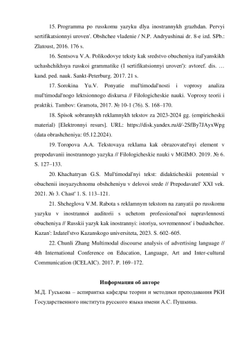 21. Щеглова В.М. Работа с рекламным текстом на занятии по русскому языку в иностранной аудитории с учетом профессиональной направленности обучения // Русский язык как иностранный: история, современность и будущее. Казань: Издательство Казанского университета, 2023. С. 602-605. EDN: GVFMTQ