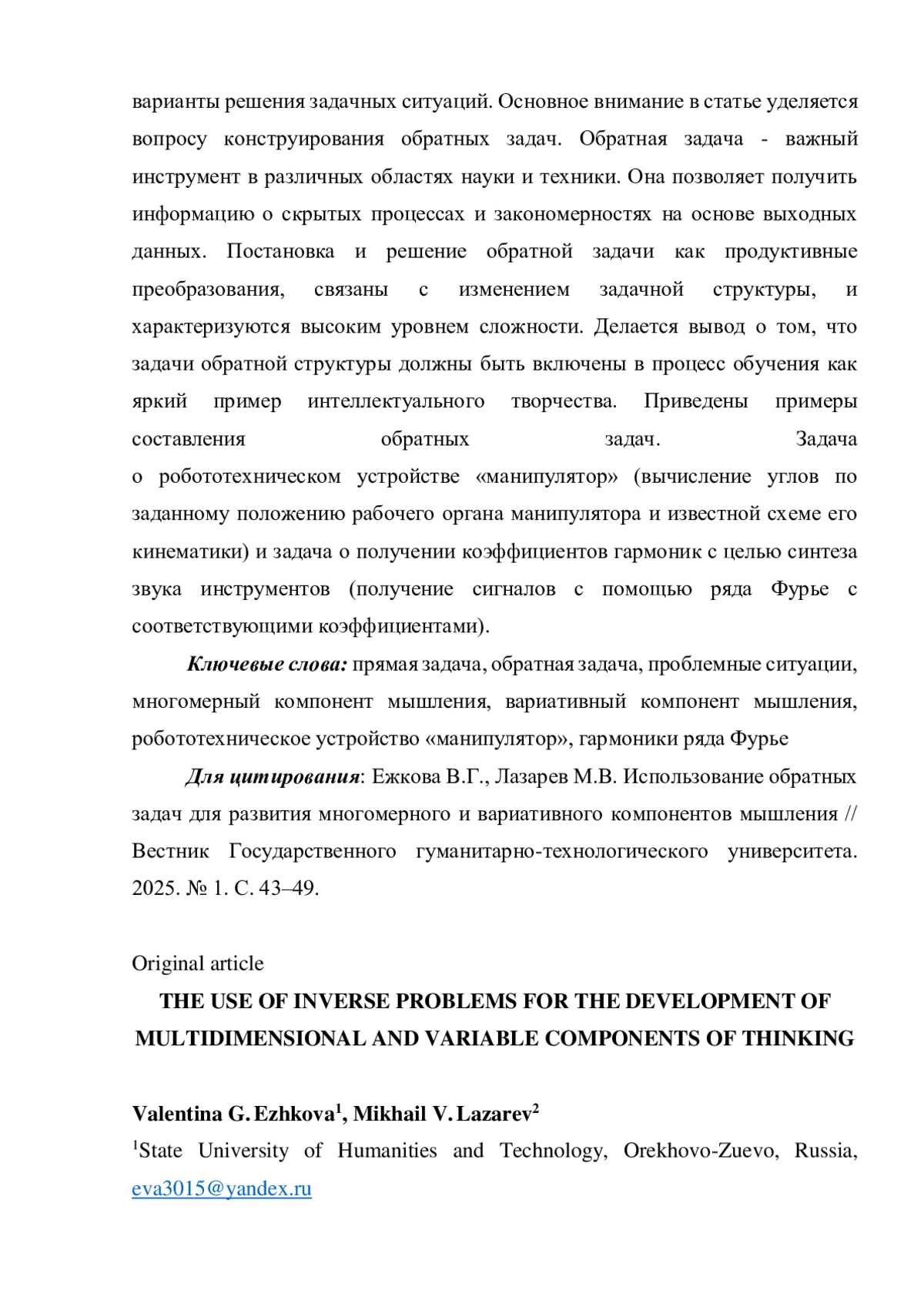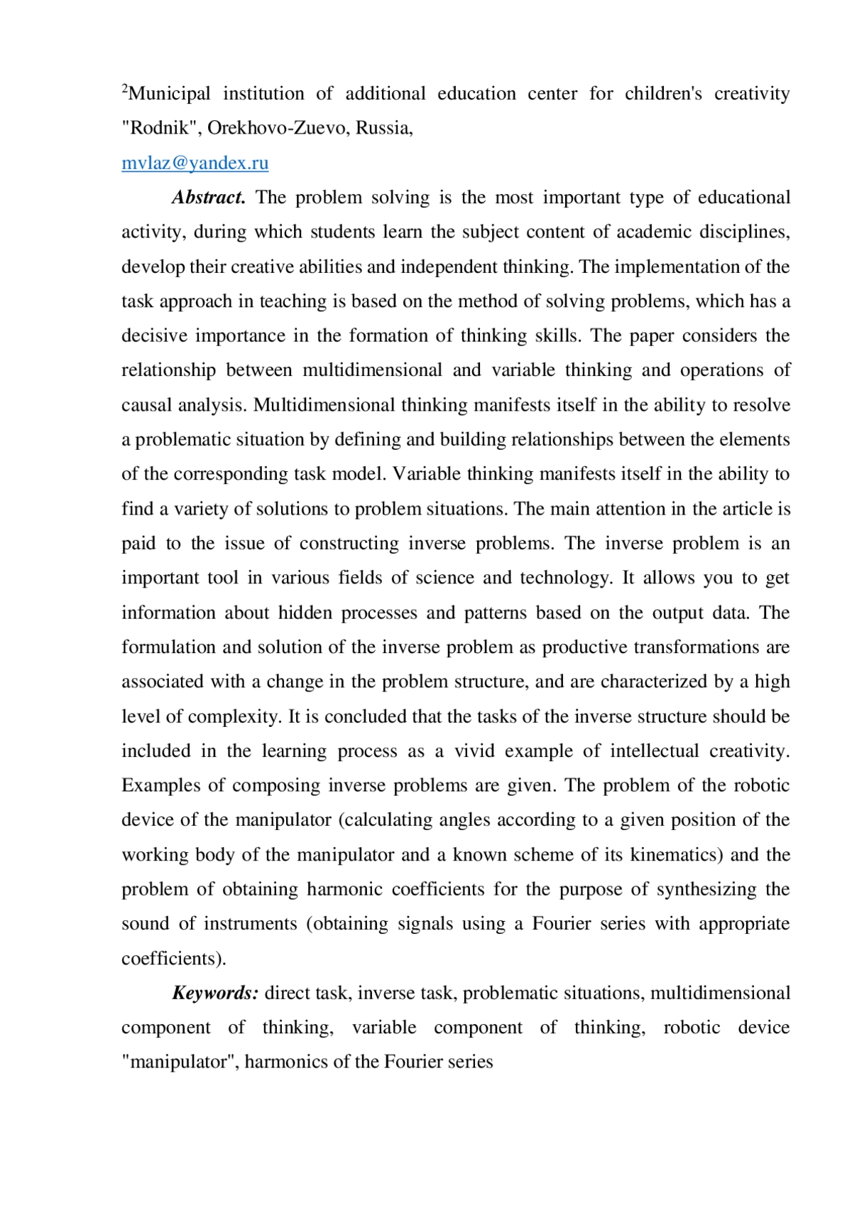 Решение задач - важнейший вид учебной деятельности, в процессе которого обучающимися усваивается предметное содержание учебных дисциплин, развиваются их творческие способности и самостоятельность мышления. В основе реализации задачного подхода в обучении лежит методика решения задач, которая имеет определяющую значимость в формировании мыслительных умений. В работе рассматривается взаимосвязь между многомерным и вариативным мышлением и операциями причинно-следственного анализа. Многомерное мышление проявляется в способности разрешать проблемную ситуацию, определяя и выстраивая взаимоотношения между элементами соответствующей задачной модели. Вариативное мышление проявляется в способности находить разнообразные варианты решения задачных ситуаций. Основное внимание в статье уделяется вопросу конструирования обратных задач. Обратная задача - важный инструмент в различных областях науки и техники. Она позволяет получить информацию о скрытых процессах и закономерностях на основе выходных данных. Постановка и решение обратной задачи как продуктивные преобразования, связаны с изменением задачной структуры, и характеризуются высоким уровнем сложности. Делается вывод о том, что задачи обратной структуры должны быть включены в процесс обучения как яркий пример интеллектуального творчества. Приведены примеры составления обратных задач. Задача о робототехническом устройстве «манипулятор» (вычисление углов по заданному положению рабочего органа манипулятора и известной схеме его кинематики) и задача о получении коэффициентов гармоник с целью синтеза звука инструментов (получение сигналов с помощью ряда Фурье с соответствующими коэффициентами).