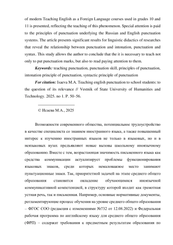 Данная статья посвящена проблеме обучения пунктуационной стороне иноязычной речи учащихся 10 и 11 классов средней общеобразовательной школы. Актуальность обучения англоязычной пунктуации представляется значимой, поскольку для эффективного решения коммуникативных задач в процессе письменного речевого общения важно уметь не только применять знаки препинания, но и адекватно их воспринимать при чтении. Методы исследования представлены анализом научно-методической литературы, обобщением и интерпретацией полученных данных. В рамках исследования проведен анализ учебных и учебно-методических пособий по методике обучения английскому языку с целью определить сущность пунктуационных навыков, их место в структуре умений письменной речи. Представлен анализ современных УМК, которые используются в 10 и 11 классах, отражающий обучение этому феномену. Особое внимание уделяется принципам пунктуации, лежащим в основе русской и английской пунктуационных систем. В статье приведены значимые в лингводидактическом отношении результаты лингвистических исследований, раскрывающих взаимосвязь пунктуации и интонации, пунктуации и синтаксиса. Проведенное исследование позволяет автору сделать вывод о необходимости обучать не только расставлять знаки препинания, а также читать с опорой на знаки препинания.