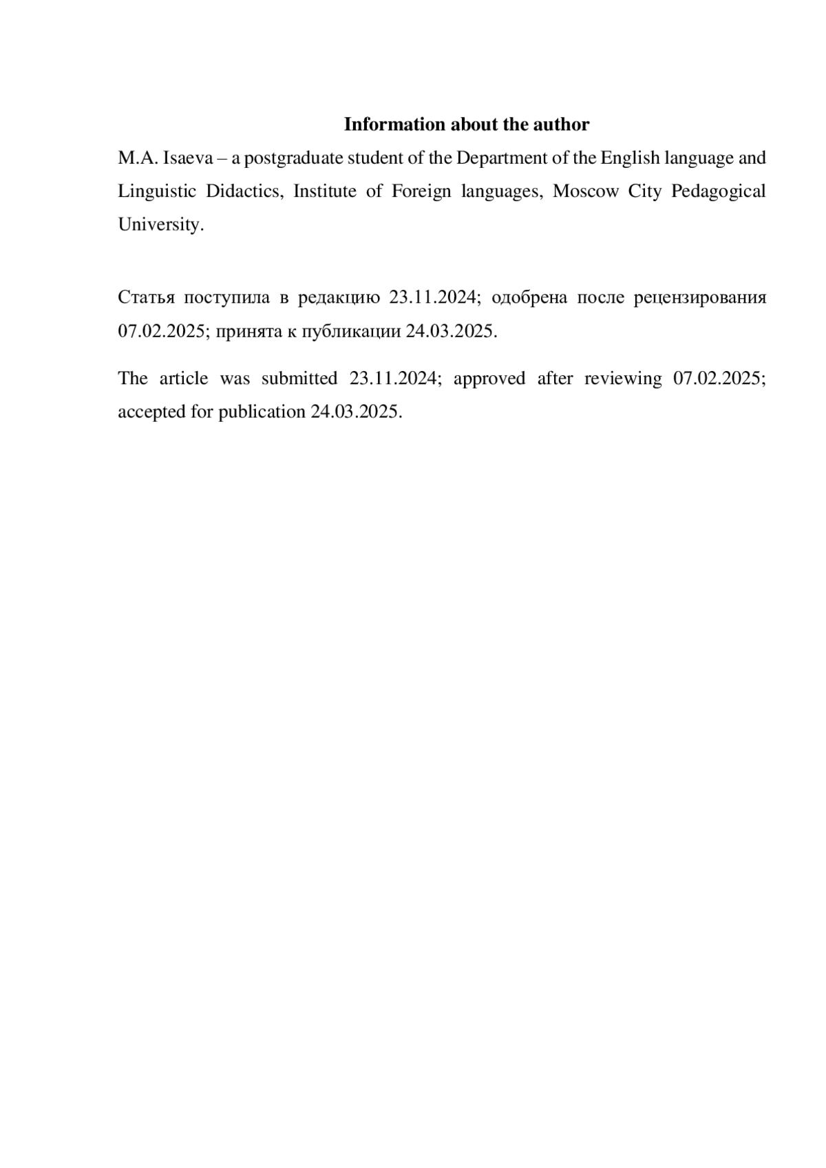 15. Татарницева С.Н. Методика обучения иностранным языкам: теория и практика: электронное учебное пособие. Тольятти: Изд-во ТГУ, 2021. [Электронный ресурс]. URL: https://dspace.tltsu.ru/bitstream/123456789/18839/1/Tatarnitseva%201-67-18__EUP_Z.pdf(датаобращения:17.11.2024).