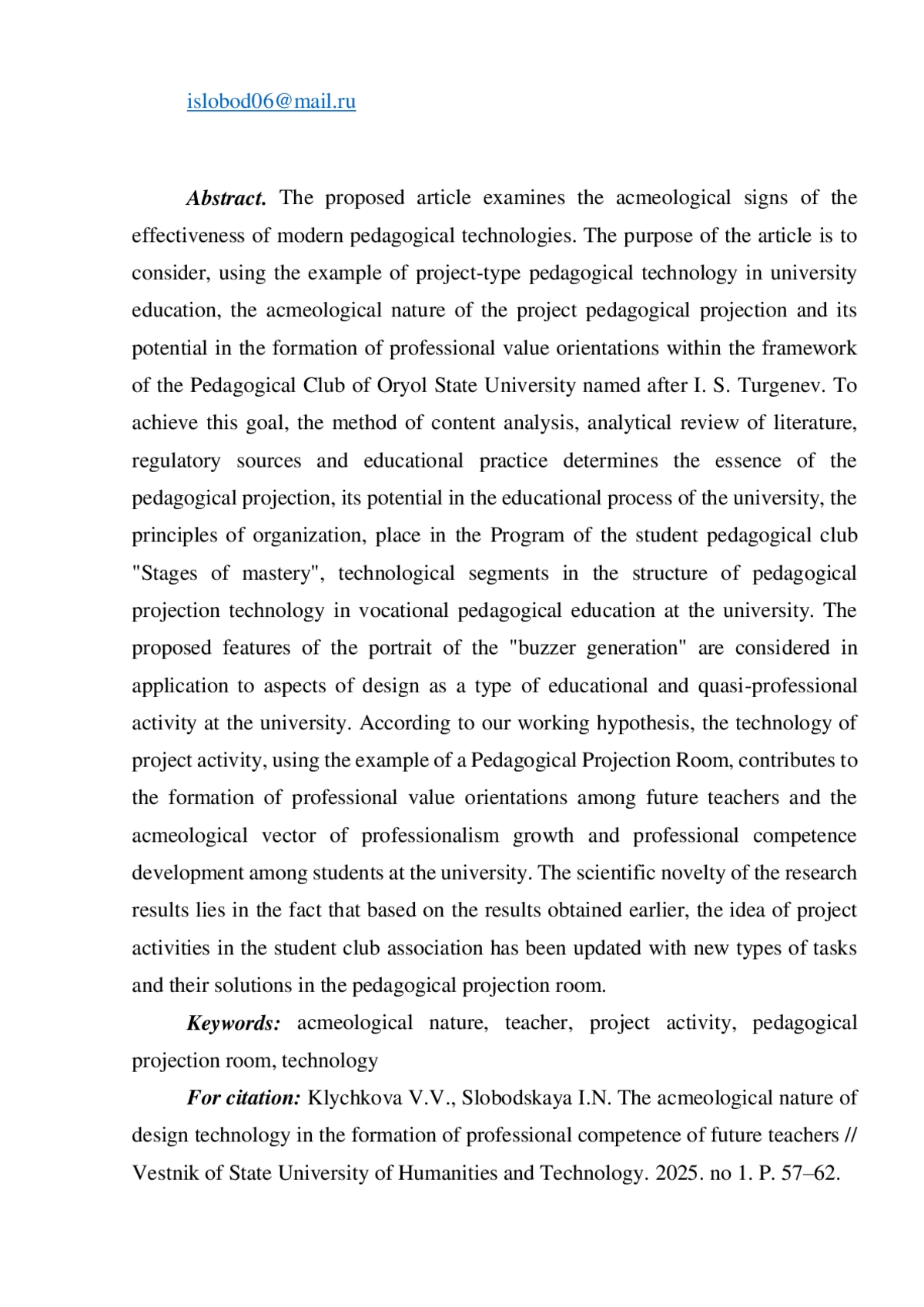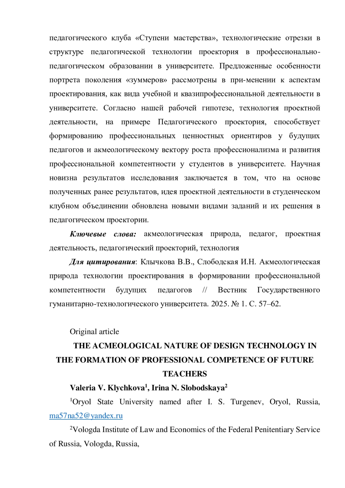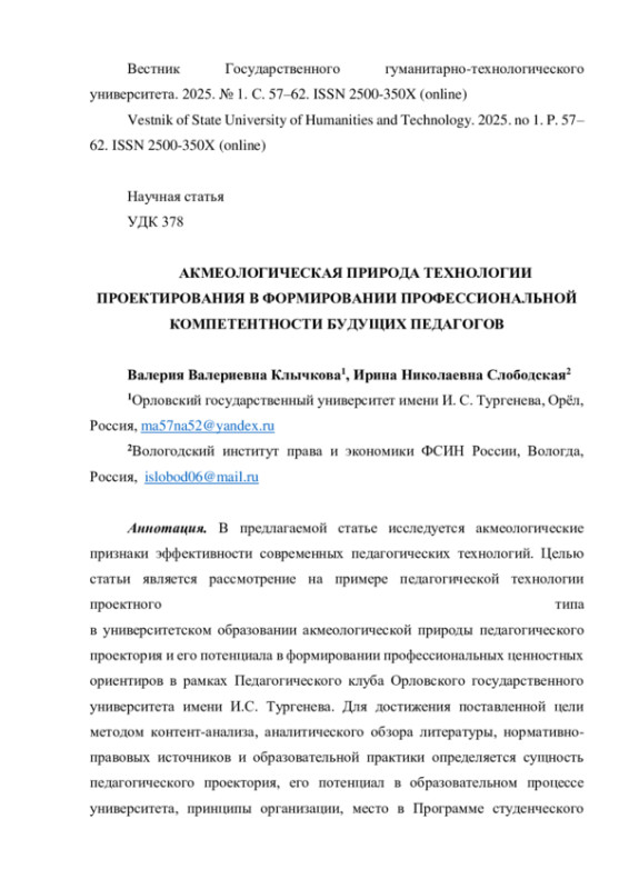 В предлагаемой статье исследуется акмеологические признаки эффективности современных педагогических технологий. Целью статьи является рассмотрение на примере педагогической технологии проектного типа в университетском образовании акмеологической природы педагогического проектория и его потенциала в формировании профессиональных ценностных ориентиров в рамках Педагогического клуба Орловского государственного университета имени И. С. Тургенева. Для достижения поставленной цели методом контент-анализа, аналитического обзора литературы, нормативно-правовых источников и образовательной практики определяется сущность педагогического проектория, его потенциал в образовательном процессе университета, принципы организации, место в Программе студенческого педагогического клуба «Ступени мастерства», технологические отрезки в структуре педагогической технологии проектория в профессионально-педагогическом образовании в университете. Предложенные особенности портрета поколения «зуммеров» рассмотрены в применении к аспектам проектирования, как вида учебной и квазипрофессиональной деятельности в университете. Согласно нашей рабочей гипотезе, технология проектной деятельности, на примере Педагогического проектория, способствует формированию профессиональных ценностных ориентиров у будущих педагогов и акмеологическому вектору роста профессионализма и развития профессиональной компетентности у студентов в университете. Научная новизна результатов исследования заключается в том, что на основе полученных ранее результатов, идея проектной деятельности в студенческом клубном объединении обновлена новыми видами заданий и их решения в педагогическом проектории.