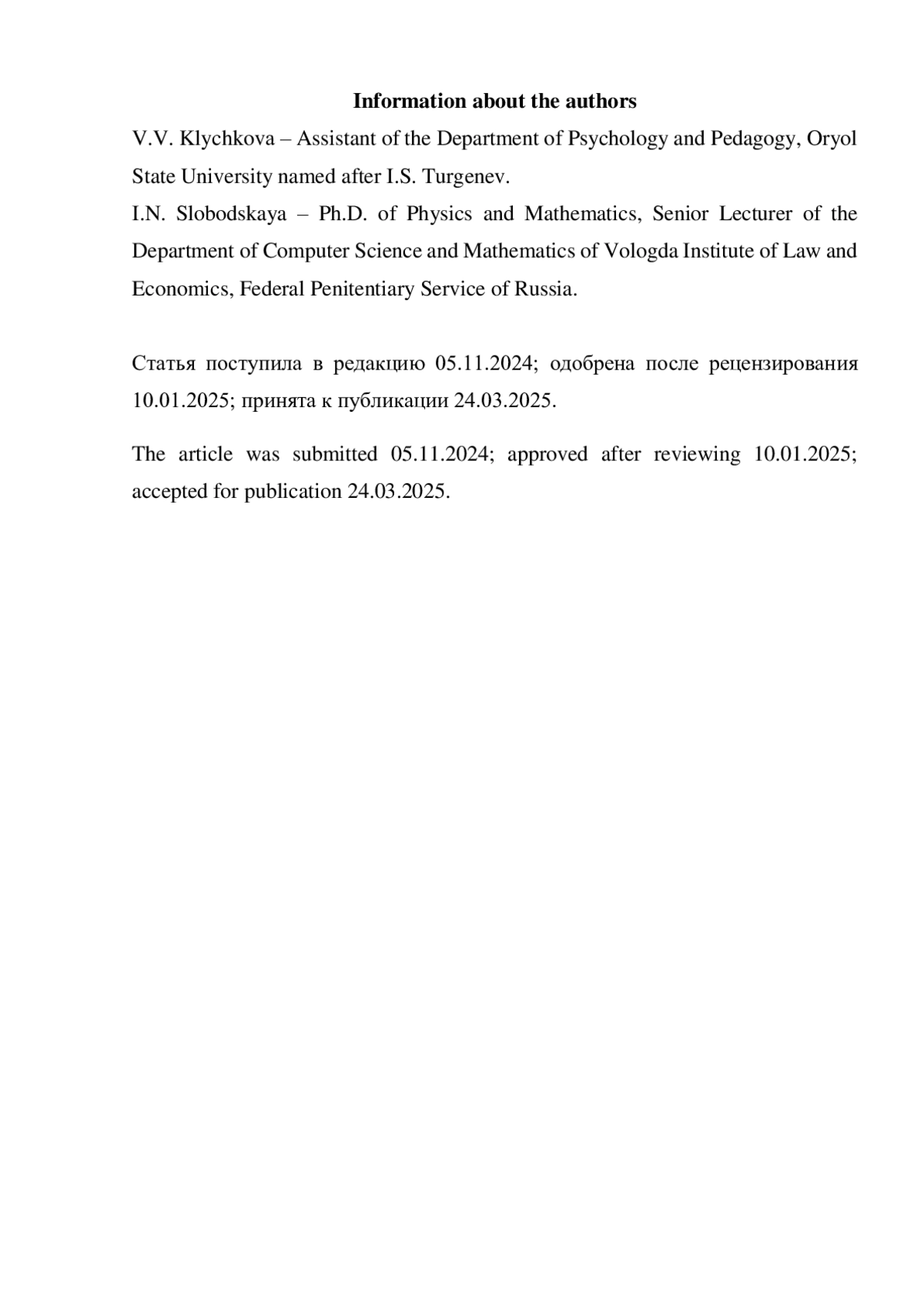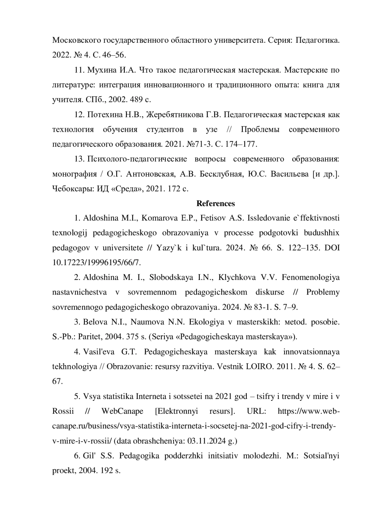 1. Алдошина М.И., Комарова Э.П., Фетисов А.С. Исследование эффективности технологий педагогического образования в процессе подготовки будущих педагогов в университете // Язык и культура. 2024. № 66. С. 122-135. DOI: 10.17223/19996195/66/7