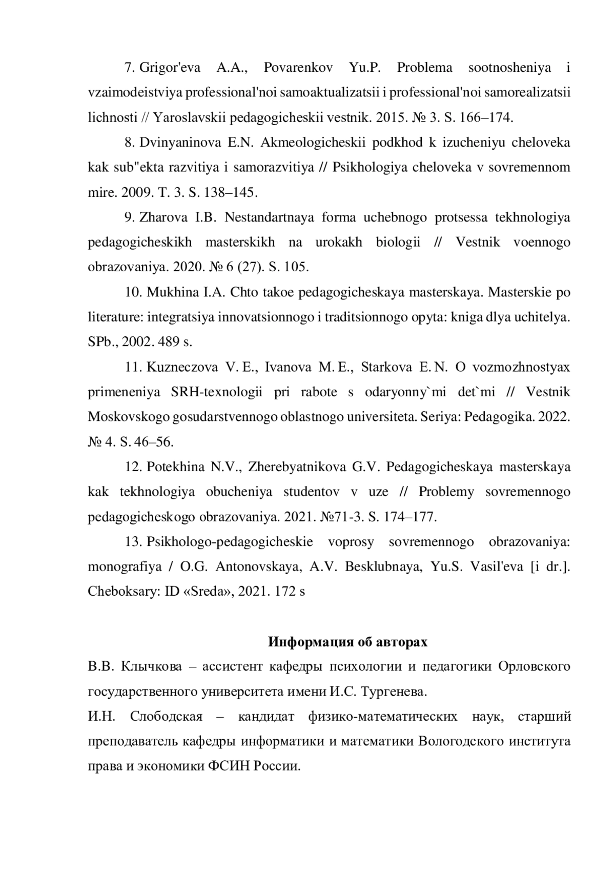 12. Потехина Н.В., Жеребятникова Г.В. Педагогическая мастерская как технология обучения студентов в узе // Проблемы современного педагогического образования. 2021. №71-3. С. 174-177. EDN: WLOBQT
