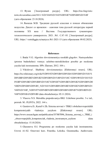 8. Лебедев А.А. Алгоритмизация глагольного словоизменения: курс дистанционного обучения по русскому языку как иностранному [Электронный ресурс]. URL: https://vpo.ggtu.ru/course/view.php?id=894(датаобращения:21.10.2024).