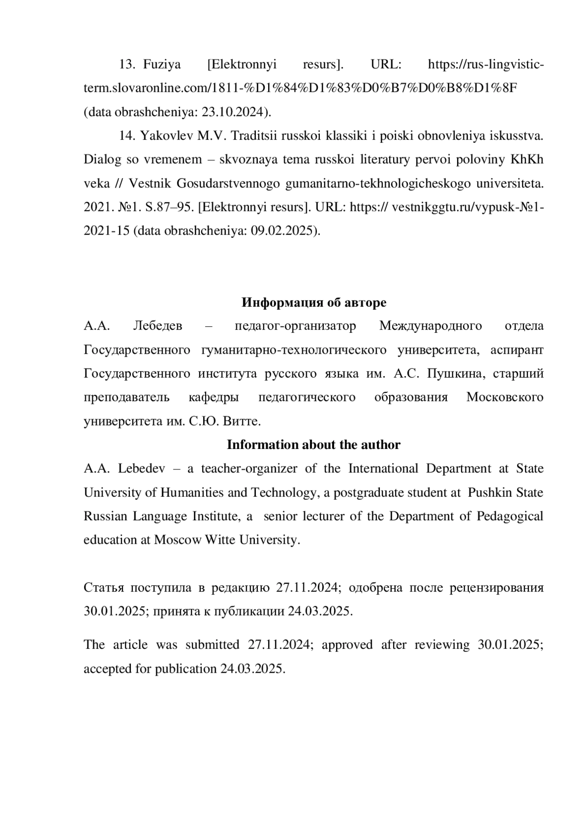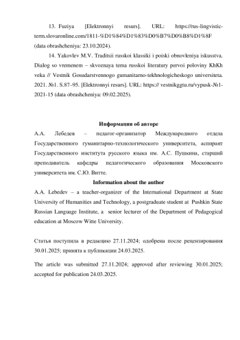 14. Яковлев М.В. Традиции русской классики и поиски обновления искусства. Диалог со временем - сквозная тема русской литературы первой половины ХХ века / Вестник Государственного гуманитарно-технологического университета. 2021. №1. С.87-95. [Электронный ресурс]. URL: https://vestnikggtu.ru/выпуск-№1-2021-15(датаобращения:09.02.2025). EDN: AIBZFB