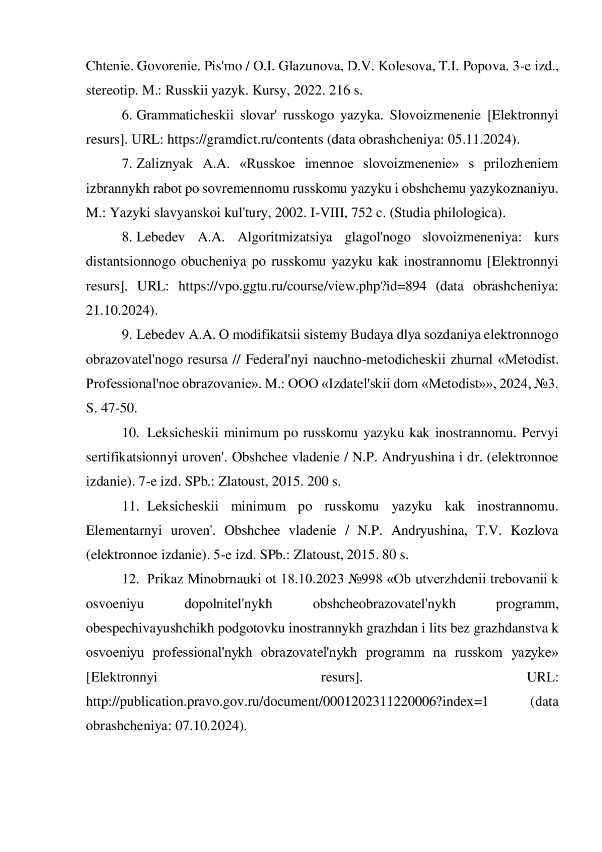 12. Приказ Минобрнауки от 18.10.2023 №998 “Об утверждении требований к освоению дополнительных общеобразовательных программ, обеспечивающих подготовку иностранных граждан и лиц без гражданства к освоению профессиональных образовательных программ на русском языке” [Электронный ресурс]. URL: http://publication.pravo.gov.ru/document/0001202311220006?index=1(датаобращения:18.10.2024).