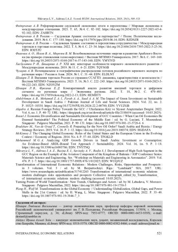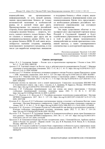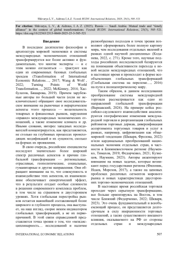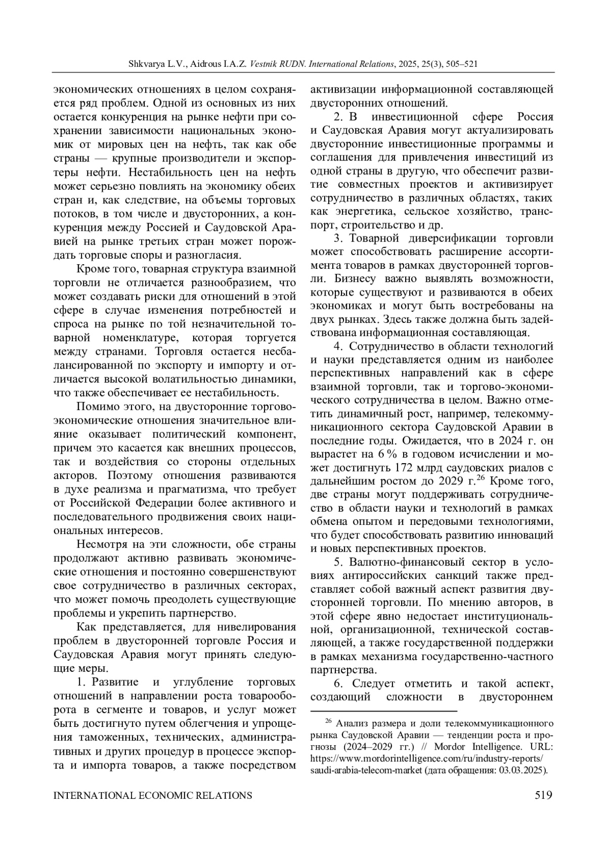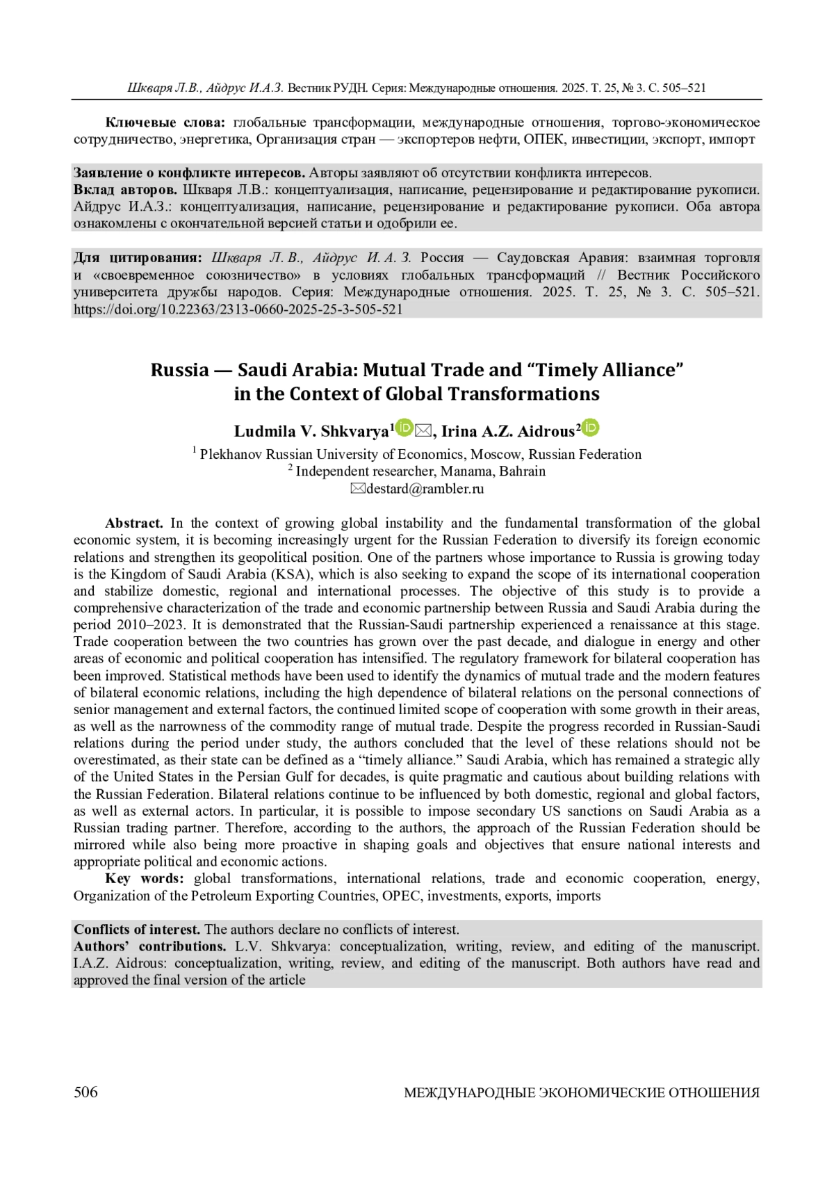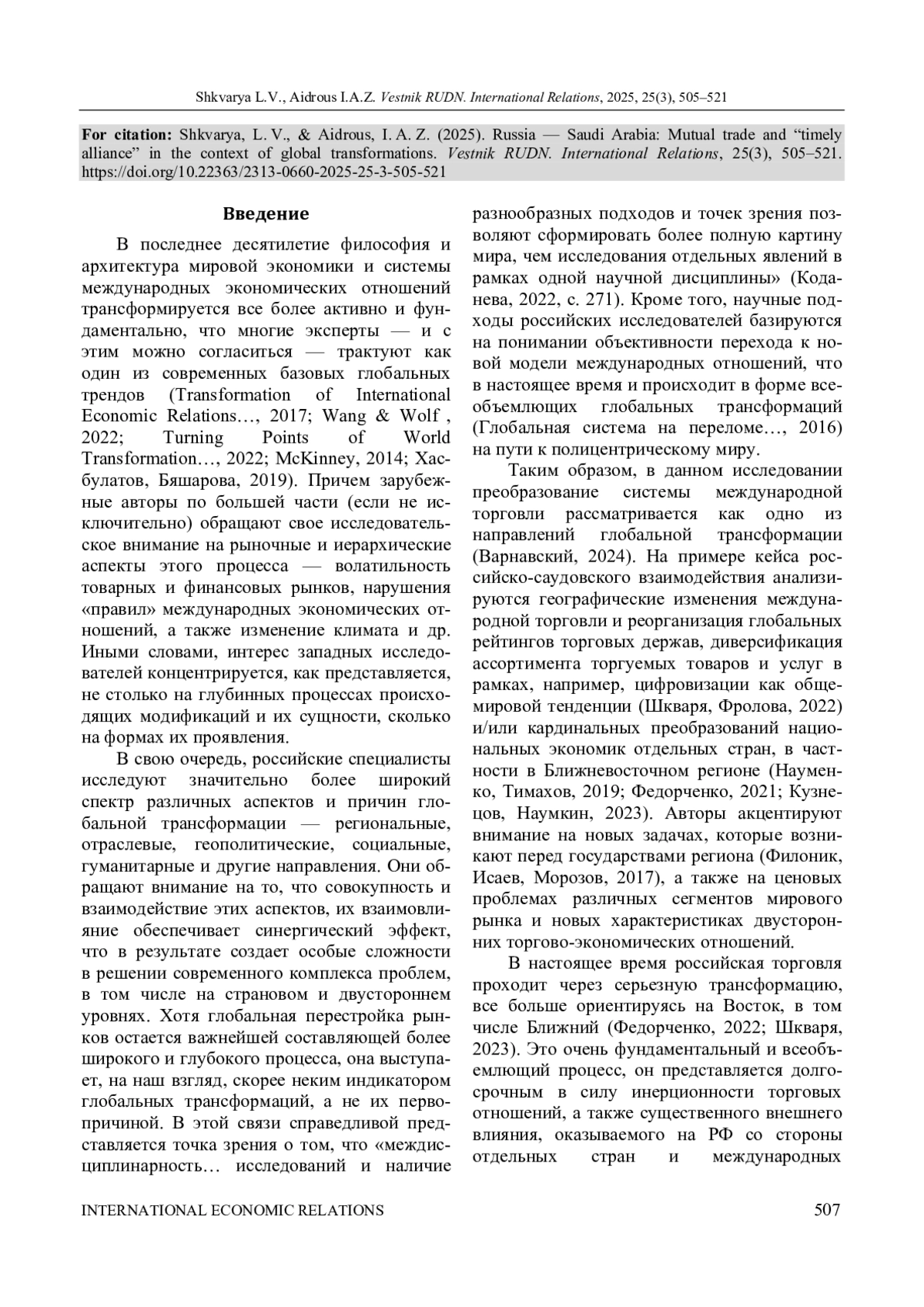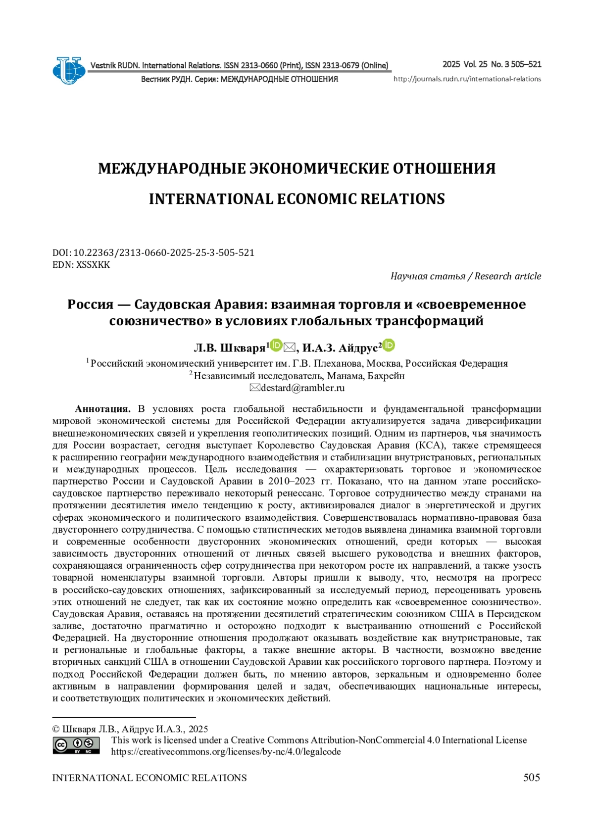 ШКВАРЯ Л. В., АЙДРУС И. А. РОССИЯ - САУДОВСКАЯ АРАВИЯ: ВЗАИМНАЯ ТОРГОВЛЯ И «СВОЕВРЕМЕННОЕ СОЮЗНИЧЕСТВО» В УСЛОВИЯХ ГЛОБАЛЬНЫХ ТРАНСФОРМАЦИЙ // ВЕСТНИК РОССИЙСКОГО УНИВЕРСИТЕТА ДРУЖБЫ НАРОДОВ. СЕРИЯ: МЕЖДУНАРОДНЫЕ ОТНОШЕНИЯ. 2025. ТОМ 25 № 3