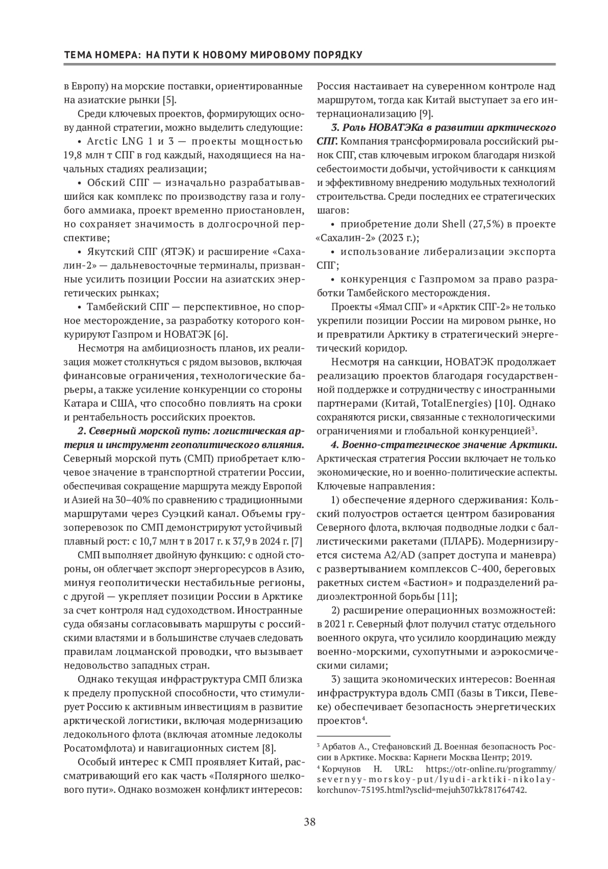 Арктический регион, ранее воспринимавшийся как отдаленная и труднодоступная территория, в последние десятилетия приобрел ключевое геополитическое и экономическое значение, особенно для России, рассматривающей его как зону стратегических интересов. Климатические изменения и таяние льдов открывают новые перспективы в области транспортных маршрутов, доступа к ресурсам и безопасности, что заставляет Москву пересматривать арктическую политику. Стратегические приоритеты России в регионе включают усиление военного присутствия, освоение углеводородных месторождений и развитие Северного морского пути (СМП). Управление Арктикой формально осуществляется восемью приполярными государствами через Арктический совет, однако его полномочия ограничены экологическими и социально-экономическими вопросами, исключая военно-политическую сферу. Внешнее влияние на регион усиливается со стороны неарктических государств, особенно Китая, позиционирующего себя как «почти арктическое государство». Стремление КНР расширить свое присутствие в регионе, несмотря на декларируемую приверженность научному и экономическому сотрудничеству, вызывает озабоченность у арктических стран и может привести к усилению конкуренции и потенциальной дестабилизации ситуации в регионе.