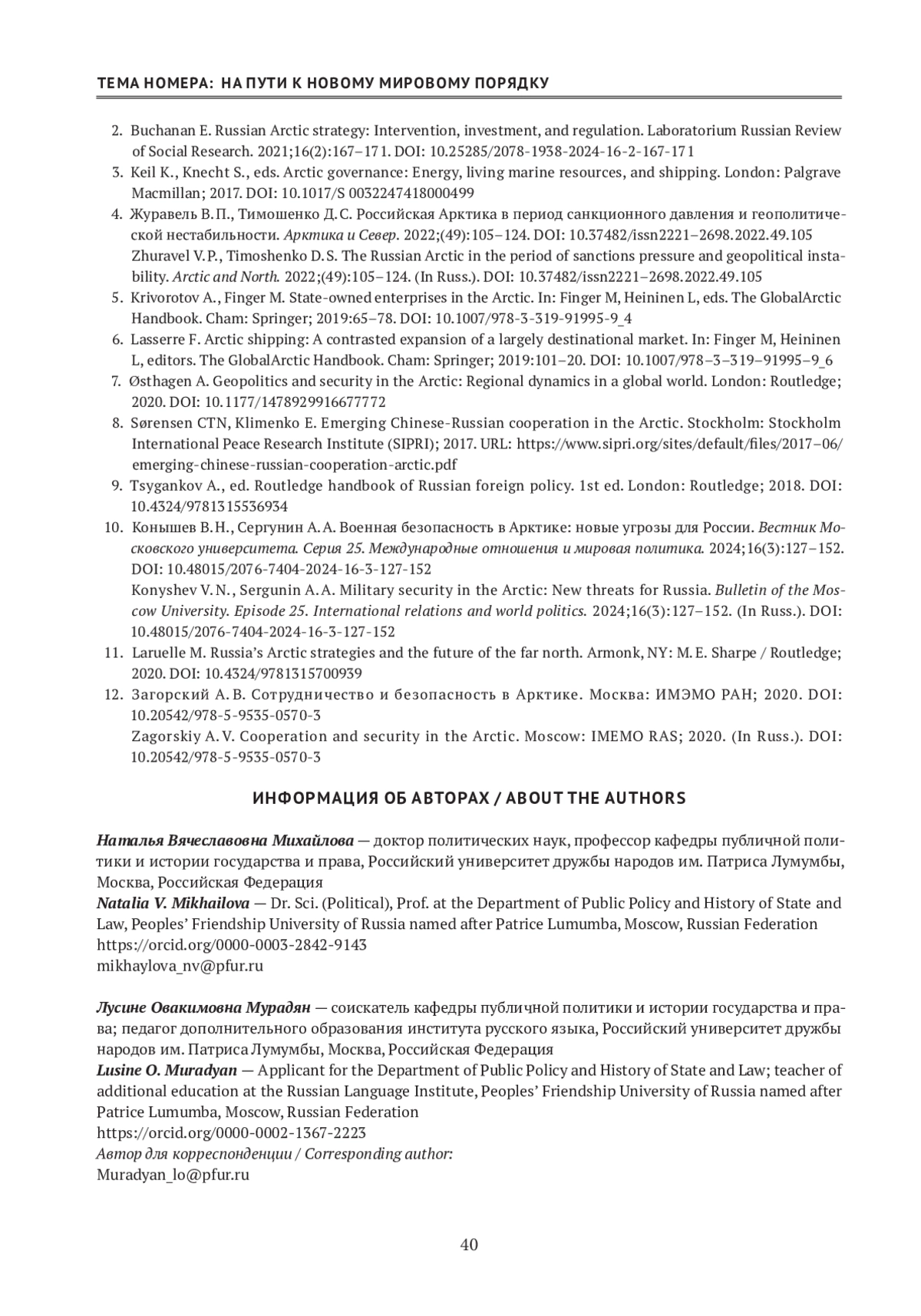 2. Buchanan E. Russian Arctic strategy: Intervention, investment, and regulation. Laboratorium Russian Review of Social Research. 2021;16(2):167-171. https://doi.org/10.25285/2078-1938-2024-16-2-167-171