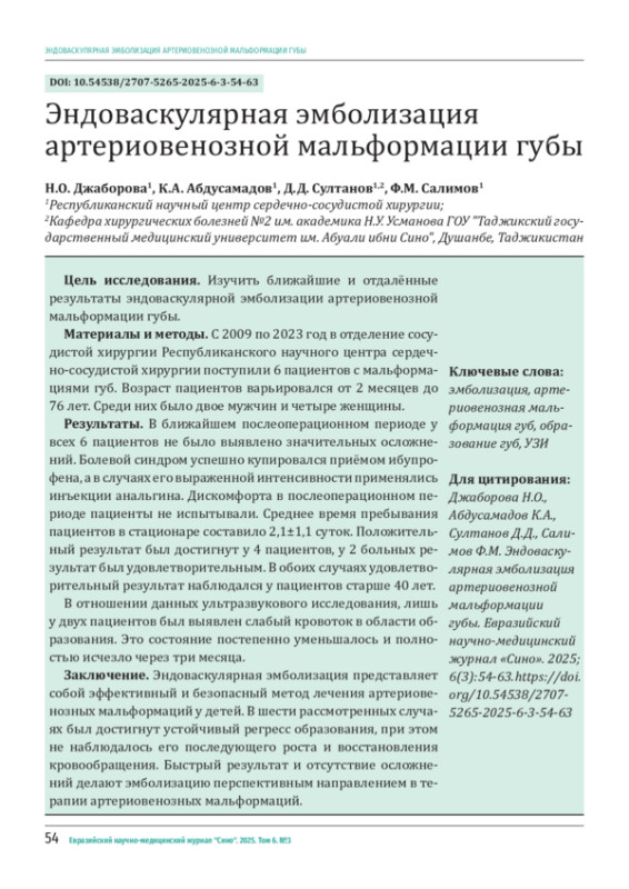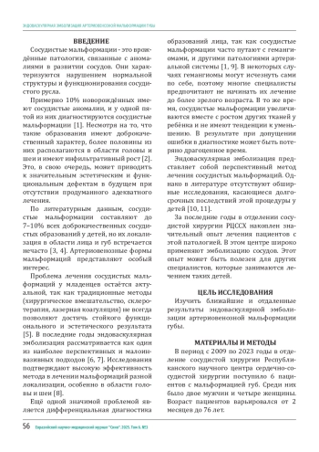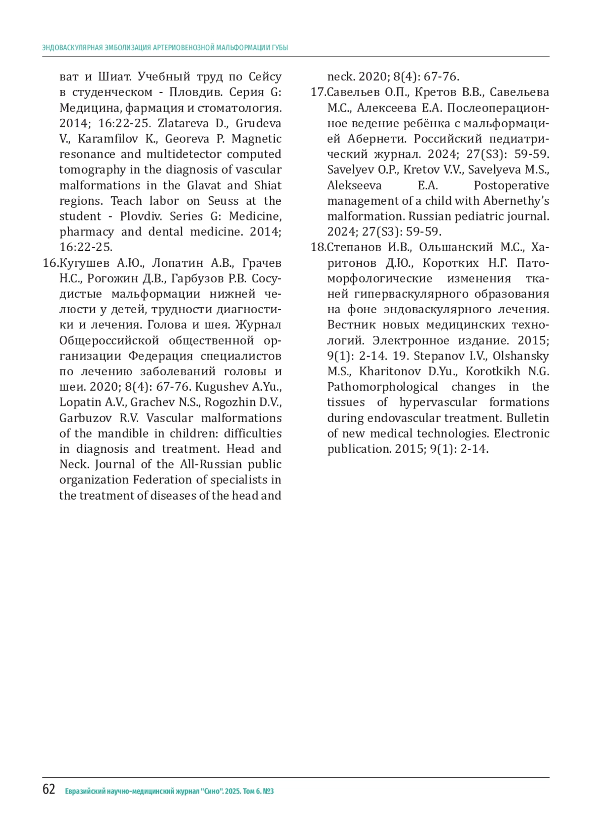 4. Liu L., Wang Y., Yang N., Chen C., Wang S., Chen L., Xu H. Comprehensive Management of a Giant Venous Malformation of the Lip: Vascular Embolization Followed by Surgical Resection and Reconstruction. Ear, Nose & Throat Journal, 2023; 01455613231213477. DOI: 10.1177/01455613231213477