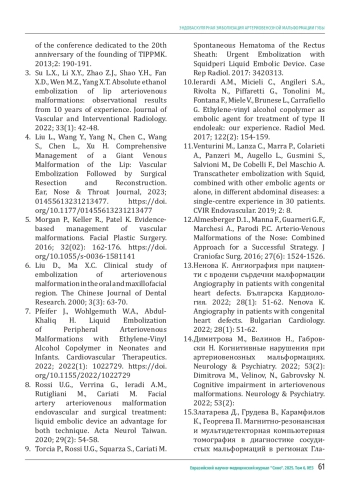 8. Rossi U.G., Verrina G., Ieradi A.M., Rutigliani M., Cariati M. Facial artery arteriovenous malformation endovascular and surgical treatment: liquid embolic device an advantage for both techniques. Acta Neurol Taiwan. 2020; 29(2): 54-58.
