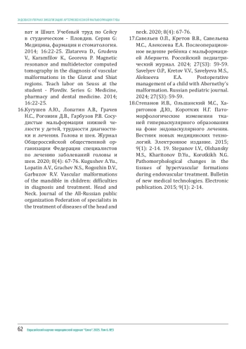16. Кугушев А.Ю., Лопатин А.В., Грачев Н.С., Рогожин Д.В., Гарбузов Р.В. Сосудистые мальформации нижней челюсти у детей, трудности диагностики и лечения. Голова и шея. Журнал Общероссийской общественной организации Федерация специалистов по лечению заболеваний головы и шеи. 2020; 8(4): 67-76.