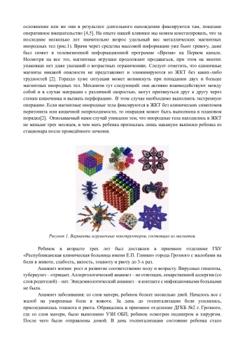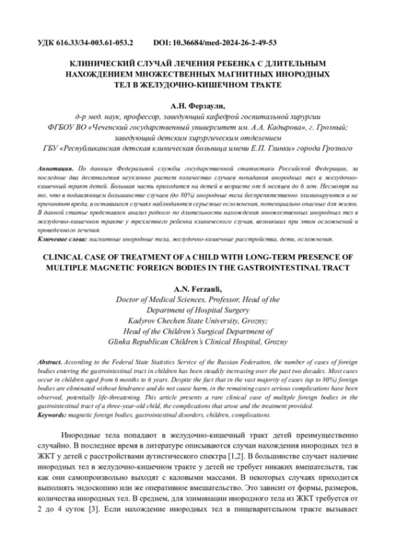 По данным Федеральной службы государственной статистики Российской Федерации, за последние два десятилетия неуклонно растет количество случаев попадания инородных тел в желудочно-кишечный тракт детей. Большая часть приходится на детей в возрасте от 6 месяцев до 6 лет. Несмотря на то, что в подавляющем большинстве случаев (до 80%) инородные тела беспрепятственно элиминируются и не причиняют вреда, в оставшихся случаях наблюдаются серьезные осложнения, потенциально опасные для жизни. В данной статье представлен анализ редкого по длительности нахождения множественных инородных тел в желудочно-кишечном тракте у трехлетнего ребенка клинического случая, возникших при этом осложнений и проведенного лечения.