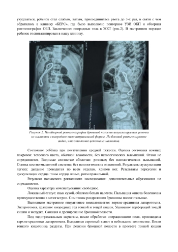 Инородные тела попадают в желудочно-кишечный тракт детей преимущественно случайно. В последнее время в литературе описываются случаи нахождения инородных тел в ЖКТ у детей с расстройствами аутистического спектра [1,2]. В большинстве случает наличие инородных тел в желудочно-кишечном тракте у детей не требует никаких вмешательств, так как они самопроизвольно выходят с каловыми массами. В некоторых случаях приходится выполнять эндоскопию или же оперативное вмешательство. Это зависит от формы, размеров, количества инородных тел.