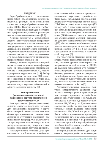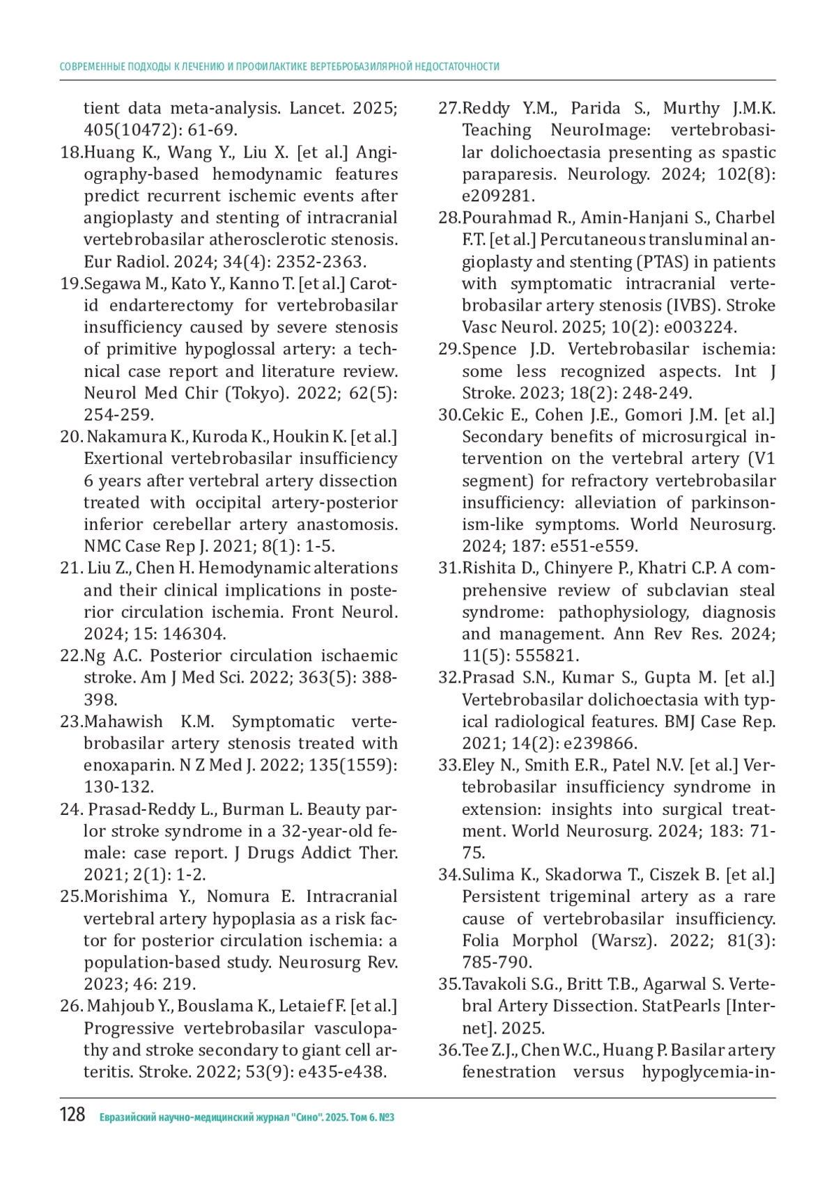 28. Pourahmad R., Amin-Hanjani S., Charbel F.T. [et al.] Percutaneous transluminal angioplasty and stenting (PTAS) in patients with symptomatic intracranial vertebrobasilar artery stenosis (IVBS). Stroke Vasc Neurol. 2025; 10(2): e003224.