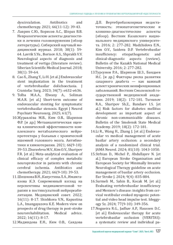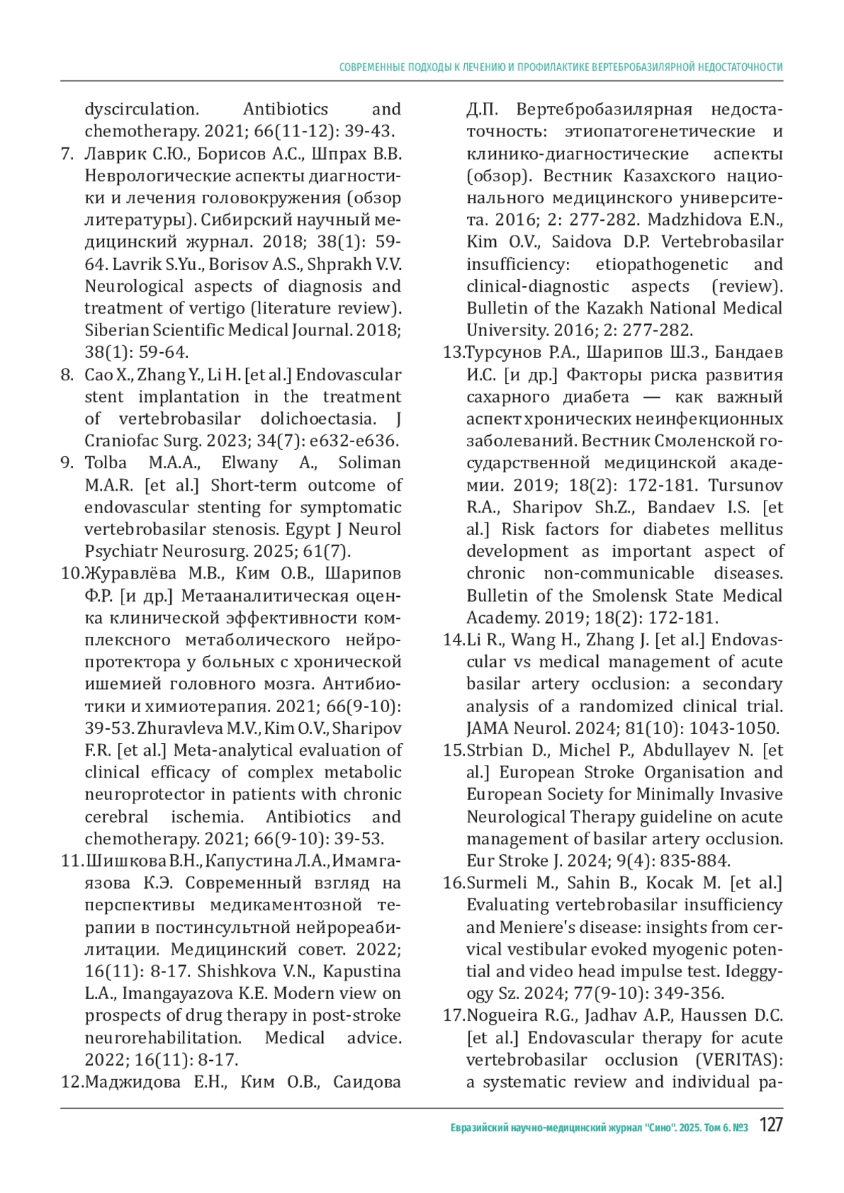 12. Маджидова Е.Н., Ким О.В., Саидова Д.П. Вертебробазилярная недостаточность: этиопатогенетические и клинико-диагностические аспекты (обзор). Вестник Казахского национального медицинского университета. 2016; 2: 277-282.