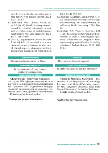 40. Dmytriw A.A., Phan K., Schirmer C.M. [et al.] Rotational vertebrobasilar insufficiency: is there a physiological spectrum? Phase-contrast magnetic resonance imaging quantification in healthy volunteers. Pediatr Neurol. 2022; 128: 58-64.