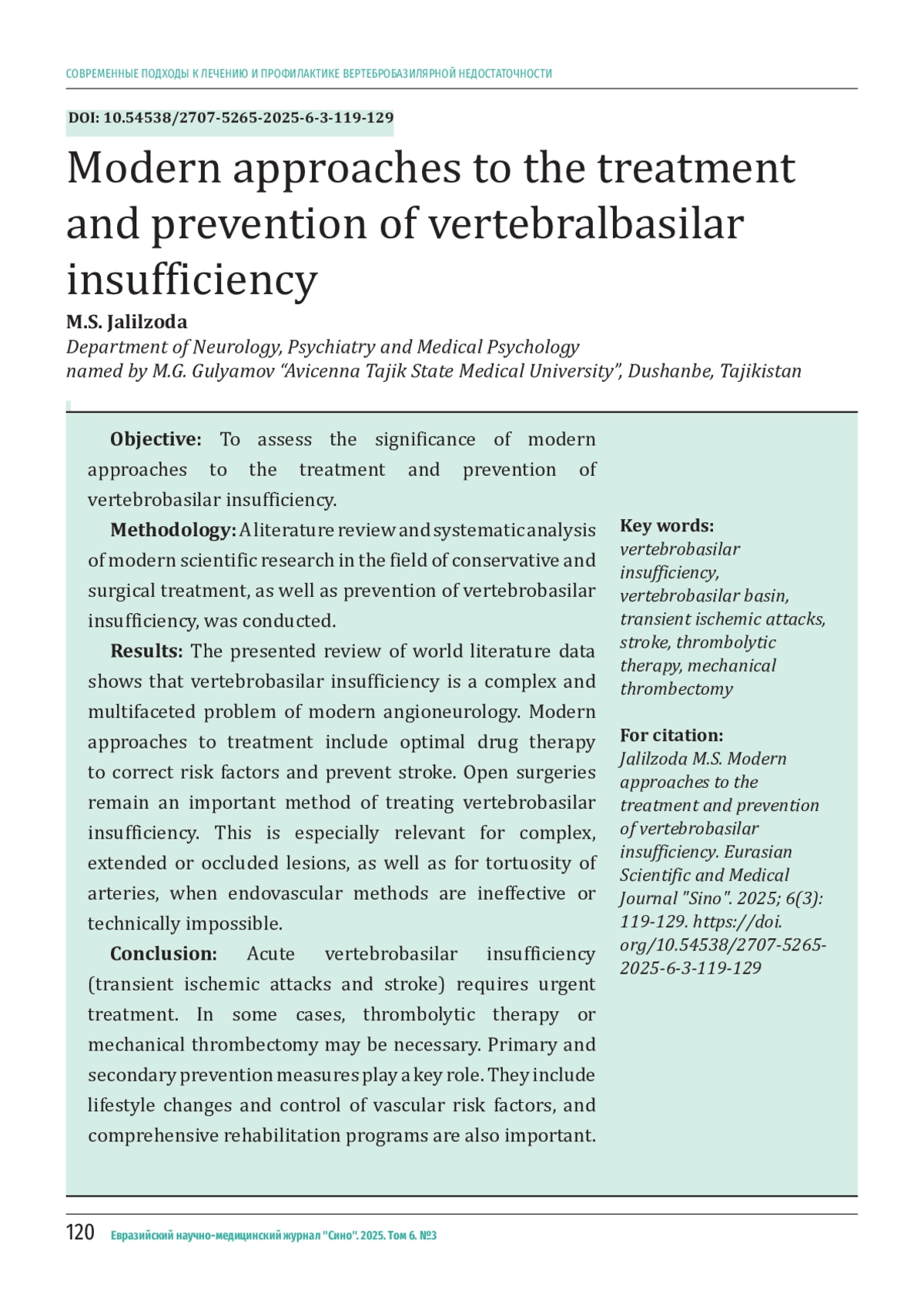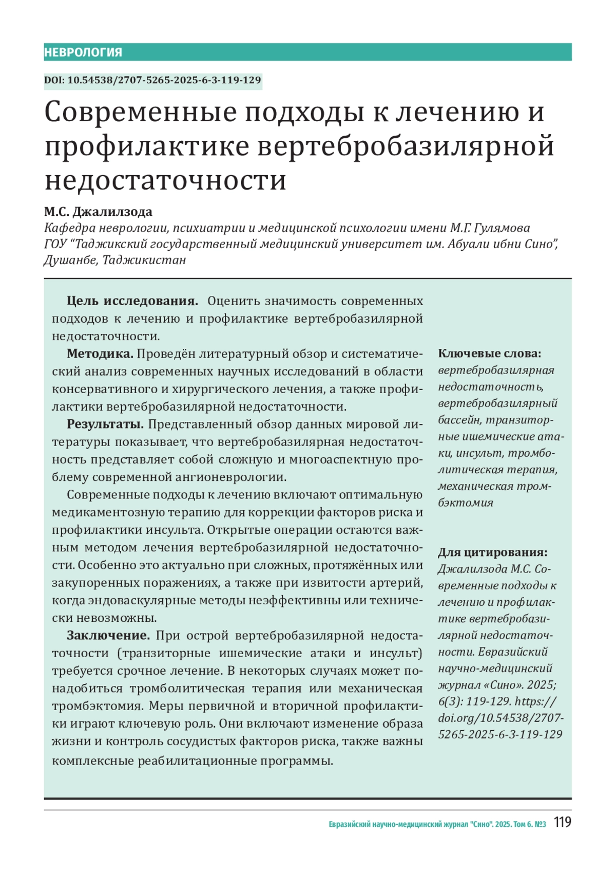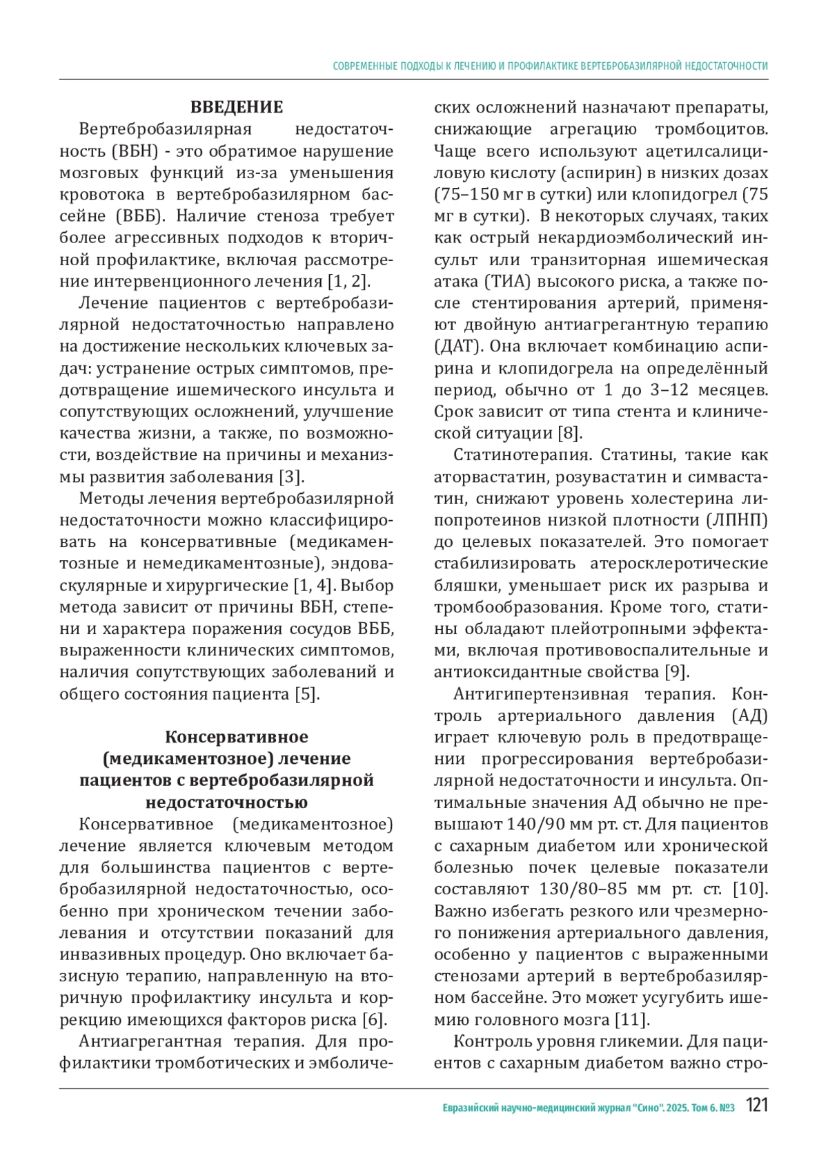 Заключение. При острой вертебробазилярной недостаточности (транзиторные ишемические атаки и инсульт) требуется срочное лечение. В некоторых случаях может понадобиться тромболитическая терапия или механическая тромбэктомия. Меры первичной и вторичной профилактики играют ключевую роль. Они включают изменение образа жизни и контроль сосудистых факторов риска, также важны комплексные реабилитационные программы.