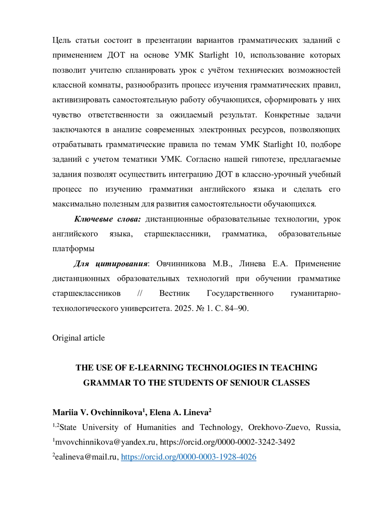 В статье исследуются вопросы применения дистанционных образовательных технологий (далее ДОТ) при обучении грамматике английского языка в старших классах. Осмысляется важность требований, предъявляемых к процессу организации внедрения ДОТ. Устанавливается следующее противоречие: несмотря на требования ФГОС СОО использовать средства информационных и коммуникационных технологий для самостоятельной работы с информацией, собственно процесс обучения самостоятельной работе на уроках до сих пор не отлажен из-за отсутствия у учителя четкого алгоритма организации уроков с использованием ДОТ. До сих пор процесс внедрения в урок ДОТ носит хаотичный характер, у учителей нет четкого механизма внедрения в урок заданий с использованием ДОТ. Это касается обучения всем языковым аспектам, в том числе и грамматическому. Цель статьи состоит в презентации вариантов грамматических заданий с применением ДОТ на основе УМК Starlight 10, использование которых позволит учителю спланировать урок с учётом технических возможностей классной комнаты, разнообразить процесс изучения грамматических правил, активизировать самостоятельную работу обучающихся, сформировать у них чувство ответственности за ожидаемый результат. Конкретные задачи заключаются в анализе современных электронных ресурсов, позволяющих отрабатывать грамматические правила по темам УМК Starlight 10, подборе заданий с учетом тематики УМК. Согласно нашей гипотезе, предлагаемые задания позволят осуществить интеграцию ДОТ в классно-урочный учебный процесс по изучению грамматики английского языка и сделать его максимально полезным для развития самостоятельности обучающихся.