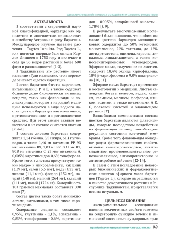 Результаты. Согласно полученным данным, объём выделенной желчи у интактных животных в среднем составил 2,76 - 2,8 мг/мин на 100 г веса. Количество секретируемой желчи за 3 часа при введении тагетола в дозах 0,01, 0,02, 0,04 г/кг веса по сравнению с контрольными группами увеличилось на 19,3%, 35,0%, 30,1 % соответственно. Тагетол, обладая желчегонными свойствами, активно влияет на химический состав желчи, в результате чего в указанных дозах снижается концентрация холестерина, по сравнению с контрольными животными на 10,5%, 21,0% и 13,2% соответственно.
