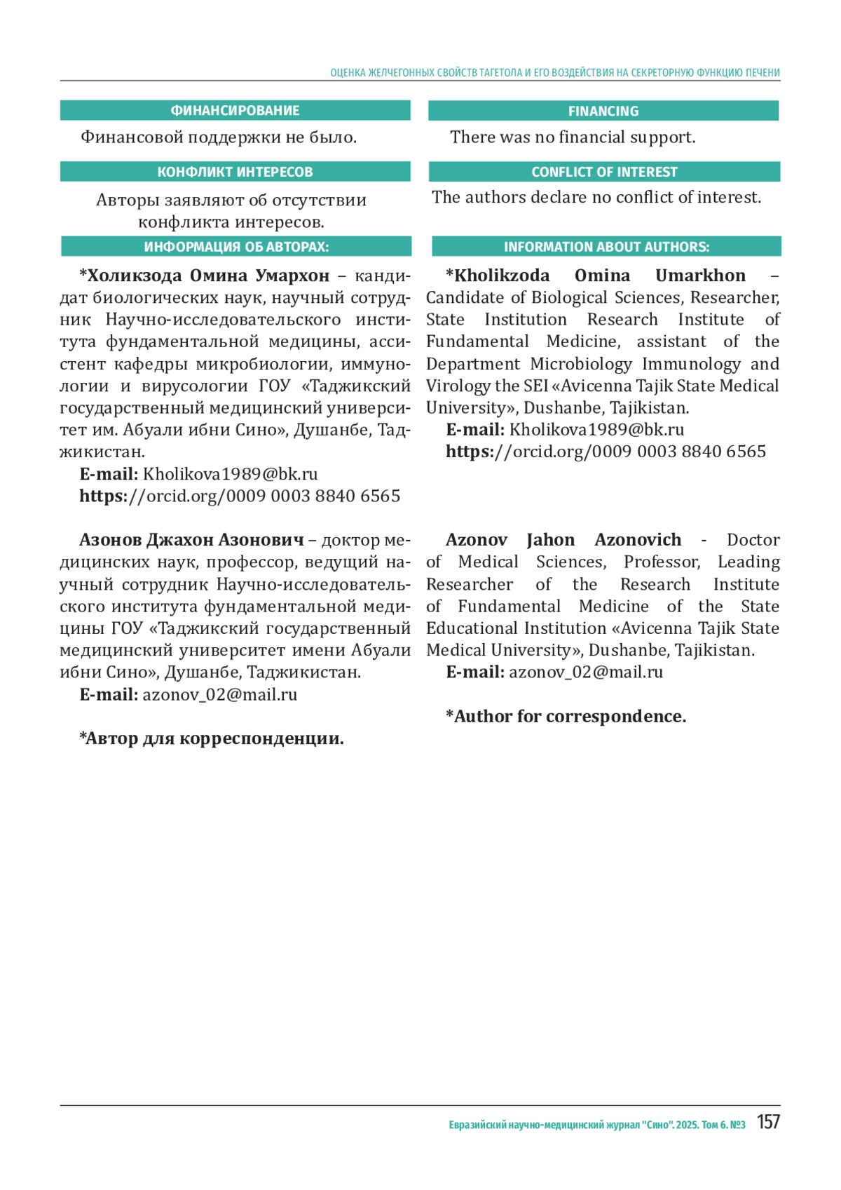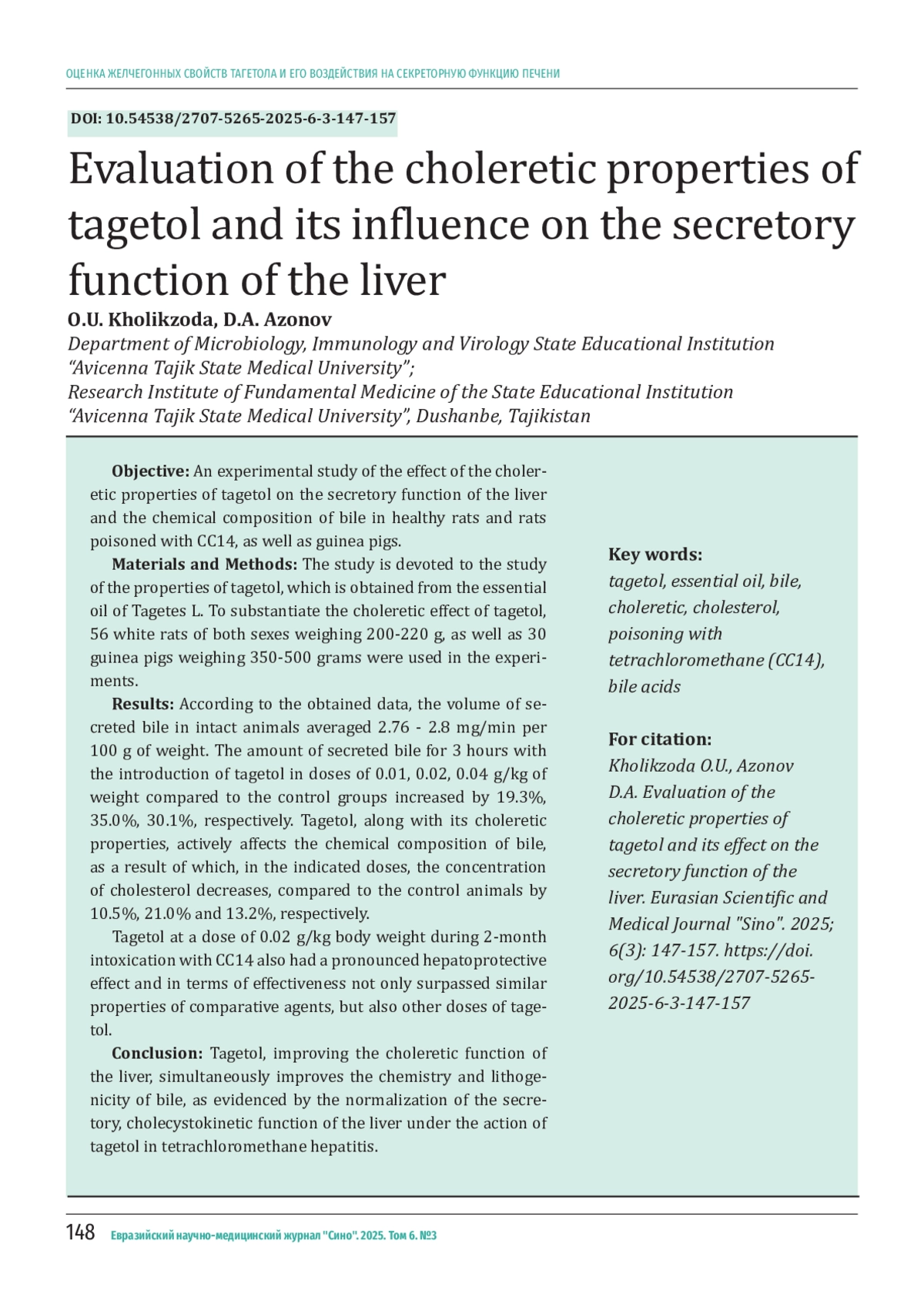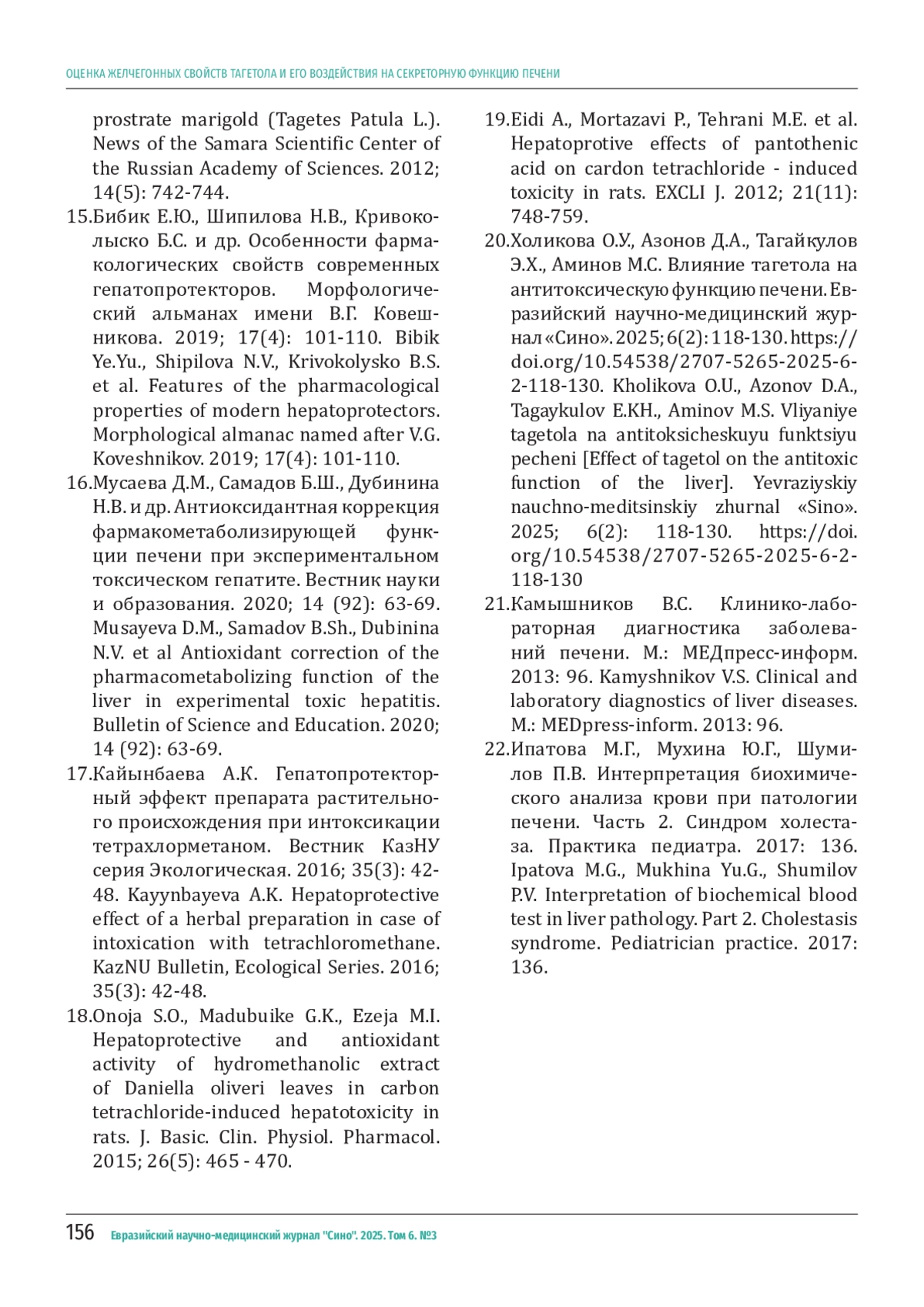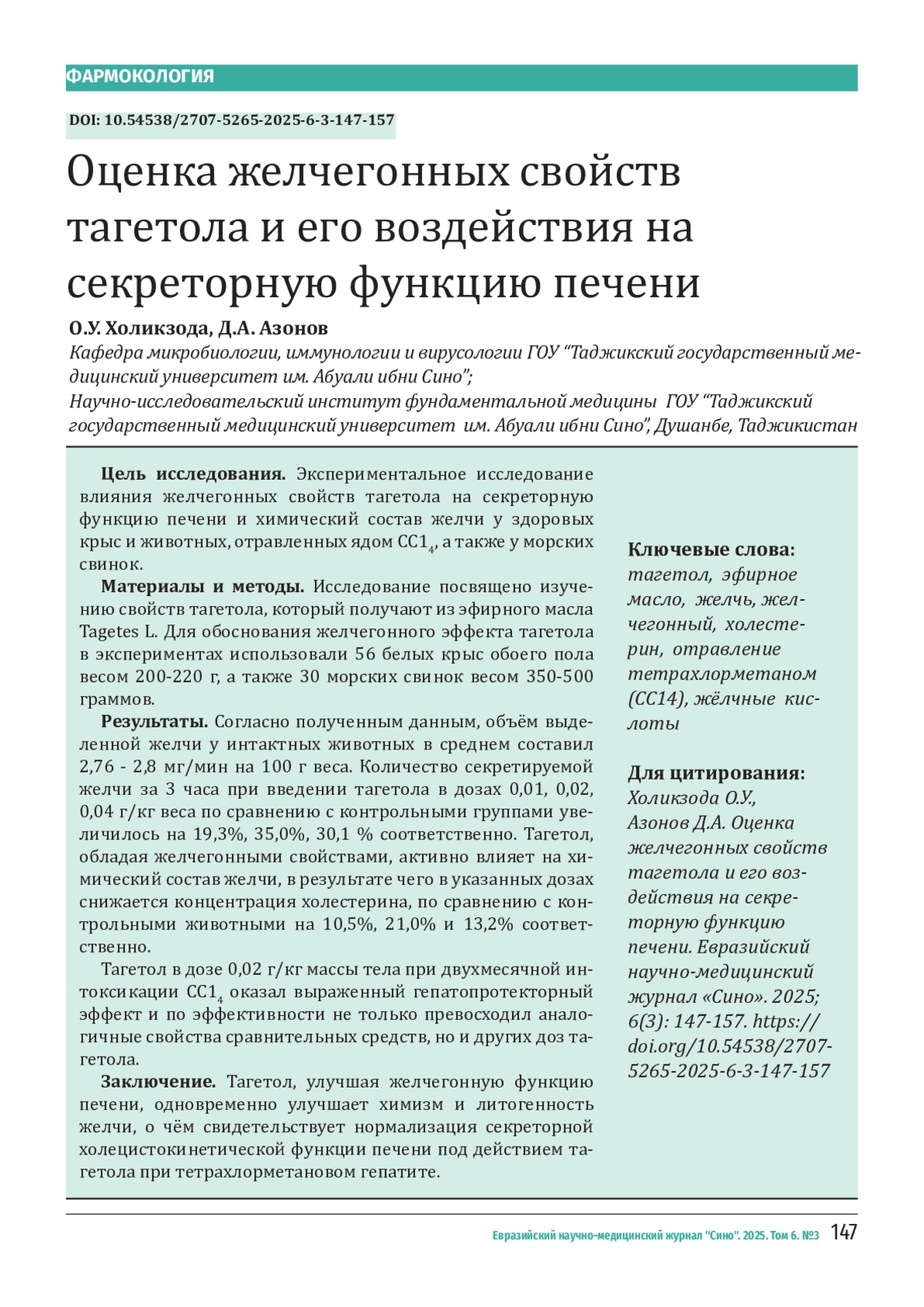 ХОЛИКЗОДА О. У., АЗОНОВ Д. А. ОЦЕНКА ЖЕЛЧЕГОННЫХ СВОЙСТВ ТАГЕТОЛА И ЕГО ВОЗДЕЙСТВИЯ НА СЕКРЕТОРНУЮ ФУНКЦИЮ ПЕЧЕНИ // ЕВРАЗИЙСКИЙ НАУЧНО-МЕДИЦИНСКИЙ ЖУРНАЛ "СИНО". 2025. № 3, ТОМ 6