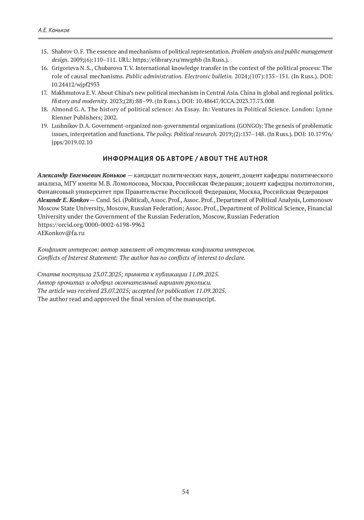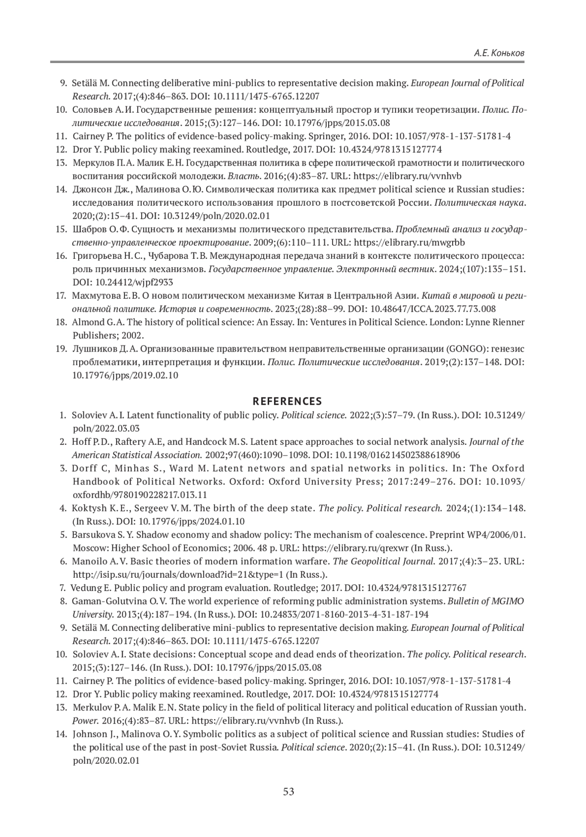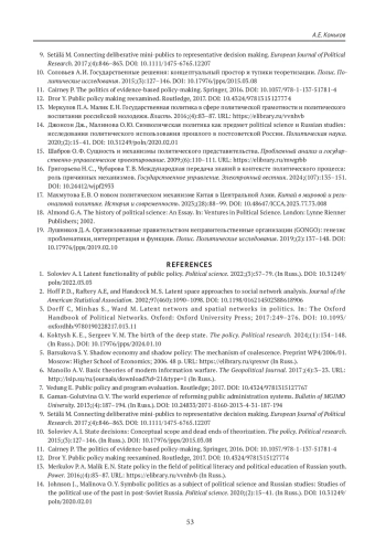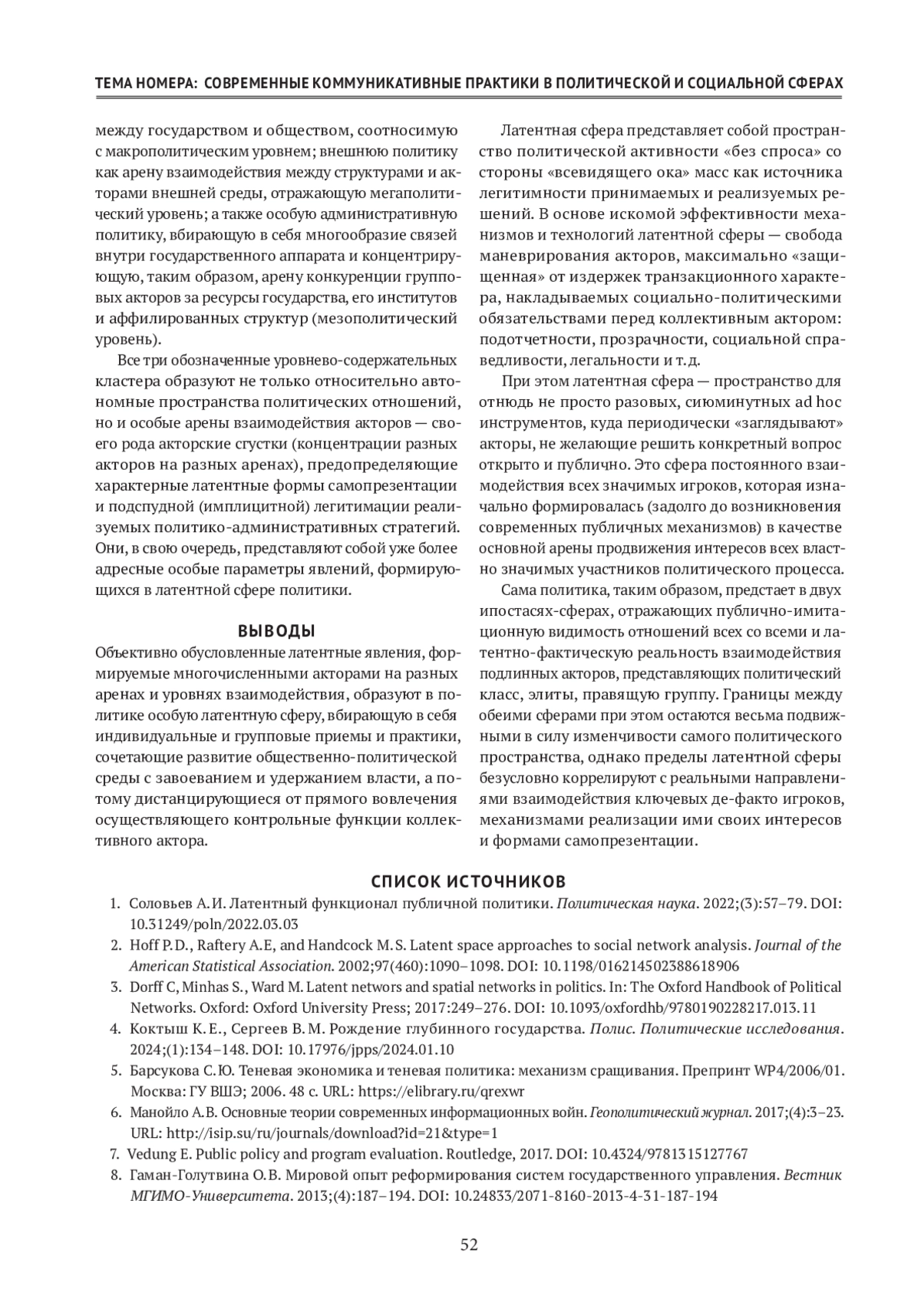 1. Соловьев А.И. Латентный функционал публичной политики. Политическая наука. 2022;(3):57-79. https://doi.org/10.31249/poln/2022.03.03