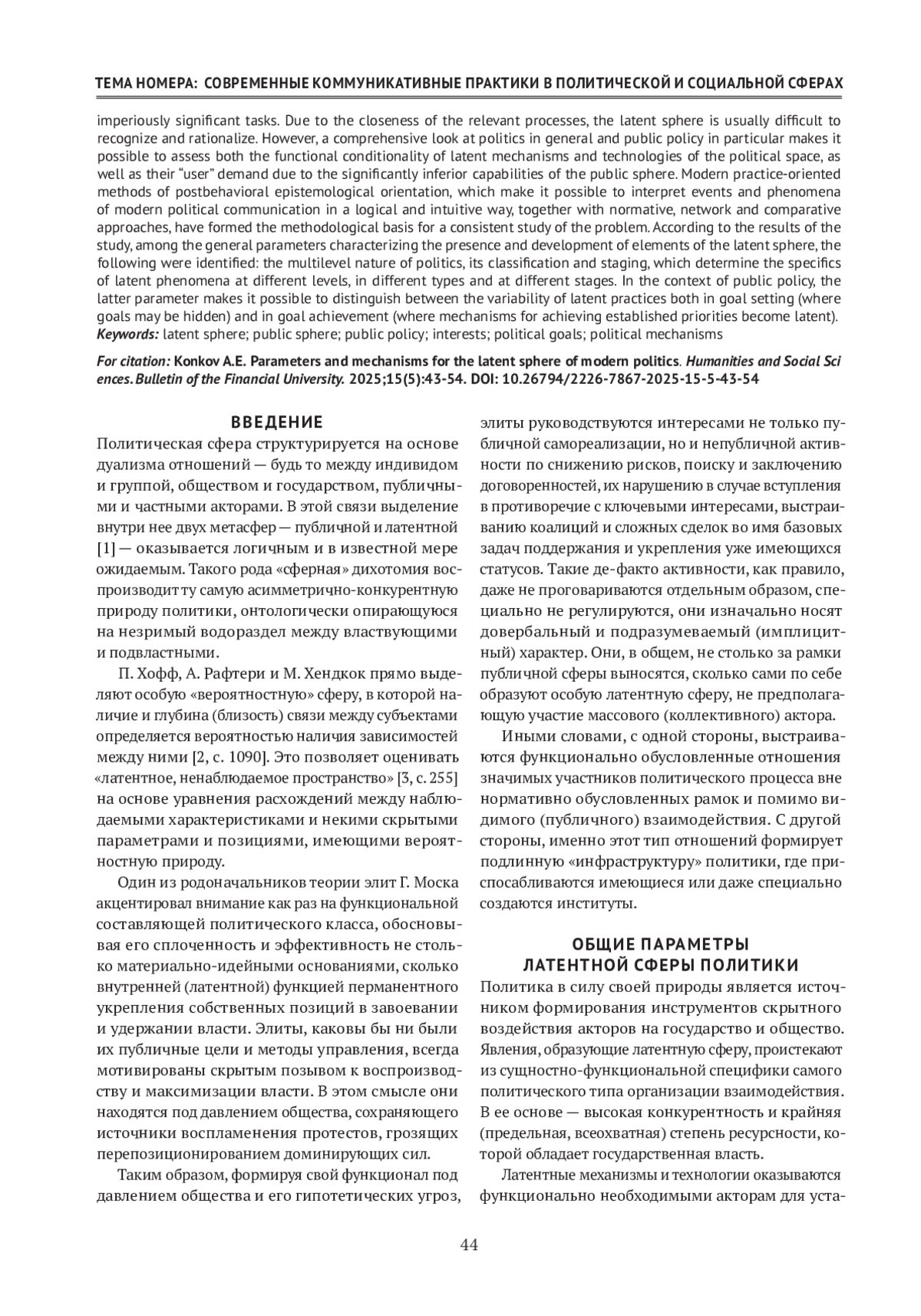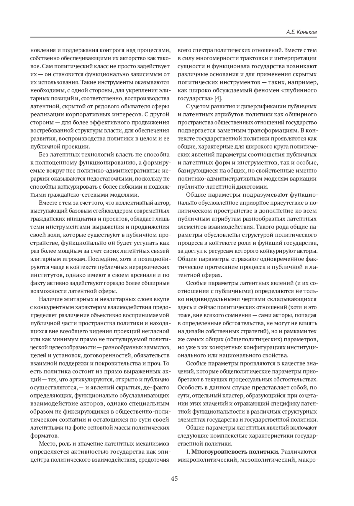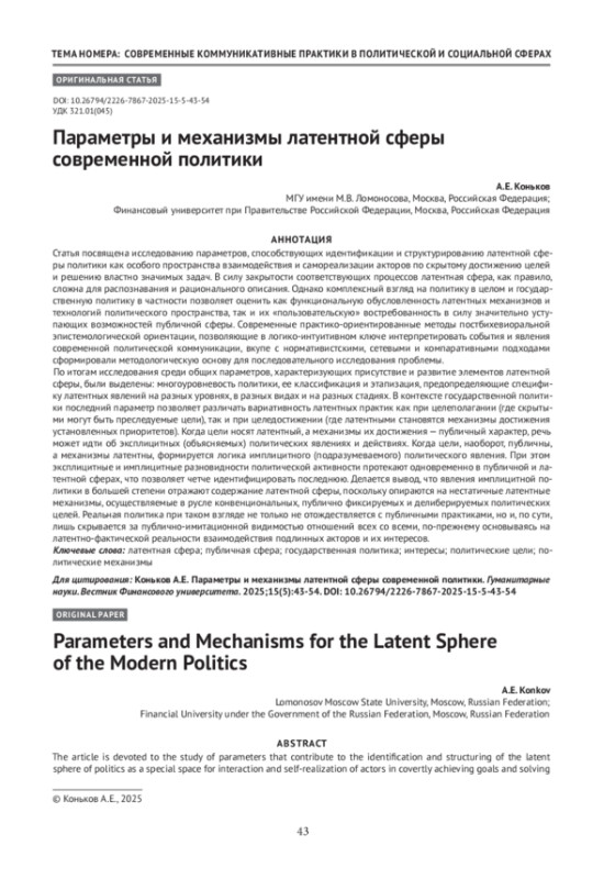 Статья посвящена исследованию параметров, способствующих идентификации и структурированию латентной сферы политики как особого пространства взаимодействия и самореализации акторов по скрытому достижению целей и решению властно значимых задач. В силу закрытости соответствующих процессов латентная сфера, как правило, сложна для распознавания и рационального описания. Однако комплексный взгляд на политику в целом и государственную политику в частности позволяет оценить как функциональную обусловленность латентных механизмов и технологий политического пространства, так и их «пользовательскую» востребованность в силу значительно уступающих возможностей публичной сферы. Современные практико-ориентированные методы постбихевиоральной эпистемологической ориентации, позволяющие в логико-интуитивном ключе интерпретировать события и явления современной политической коммуникации, вкупе с нормативистскими, сетевыми и компаративными подходами сформировали методологическую основу для последовательного исследования проблемы.