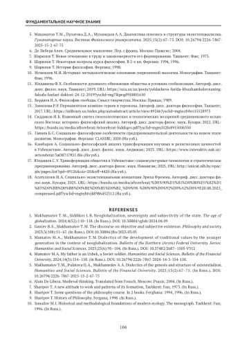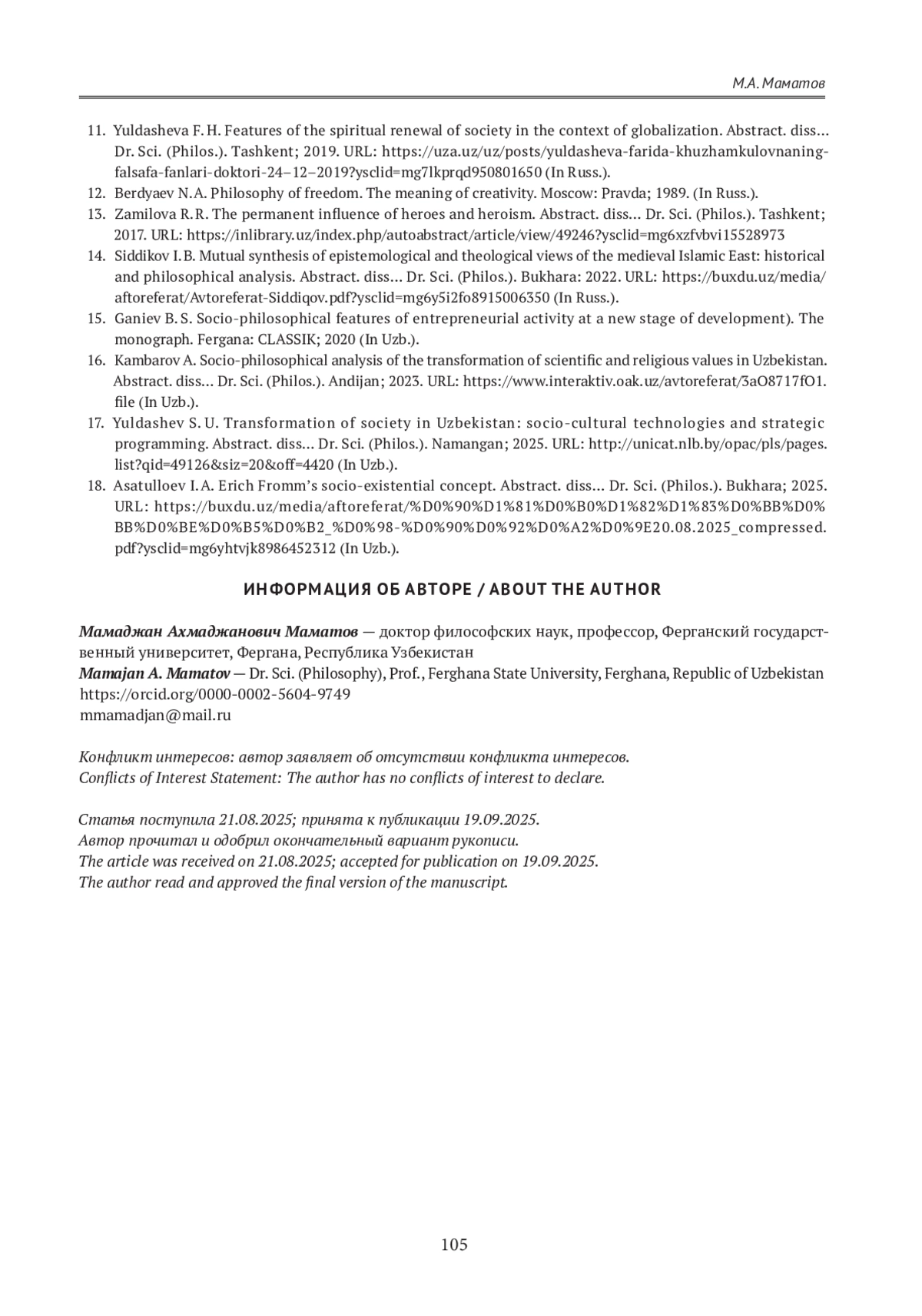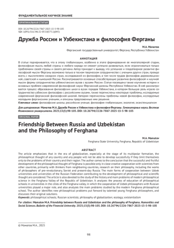 МАМАТОВ М. А. ДРУЖБА РОССИИ И УЗБЕКИСТАНА И ФИЛОСОФИЯ ФЕРГАНЫ // ГУМАНИТАРНЫЕ НАУКИ. ВЕСТНИК ФИНАНСОВОГО УНИВЕРСИТЕТА. 2025. ТОМ 15, № 5