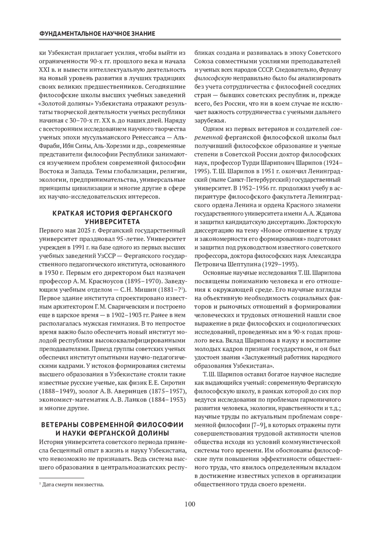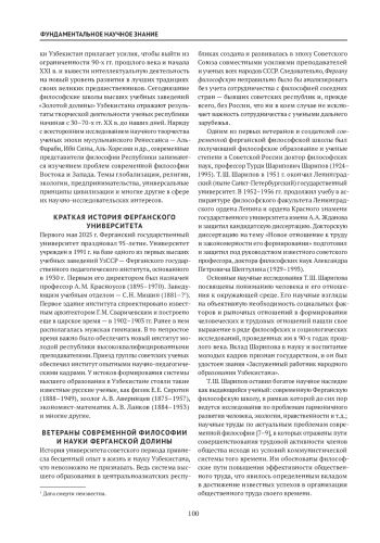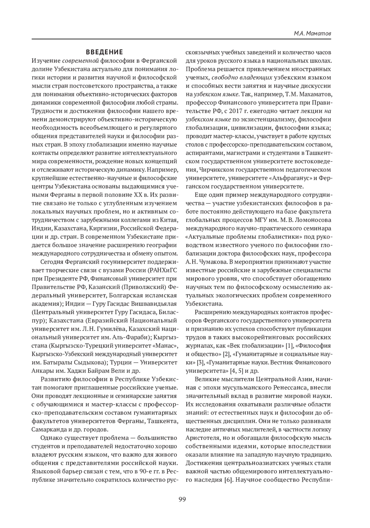 В статье подчеркивается, что в эпоху глобализации, особенно в этапе формирования ее многополярной стадии, философская мысль любой страны и любого народа не сможет успешно развиваться, если ограничиваться только проблемами своей страны и своего региона. Автор приходит к выводу, что успешное и плодотворное развитие философской мысли Ферганы возможно только в тесном творческом сотрудничестве с учеными других стран, прежде всего, с мыслителями соседних стран, исследований их философии, в том числе трудов философов дореволюционной, советской и нынешней России. Рассматриваются основные способствующие развитию философской и научной мысли формы сотрудничества узбекистанских вузов с вузами России. Статья посвящена также изучению истории и основных проблем современной философской науки Ферганской долины Республики Узбекистан. В ней рассматривается процесс образования философских школ в вузах городов Узбекистана, в котором большую роль играло сотрудничество узбекских философов с российскими вузами, также перечислены некоторые проблемы, исследуемые современной ферганской философской школой. Автором перечислены проблемы новой философии, исследуемые молодыми ферганскими учеными, и описаны предложенные ими решения.