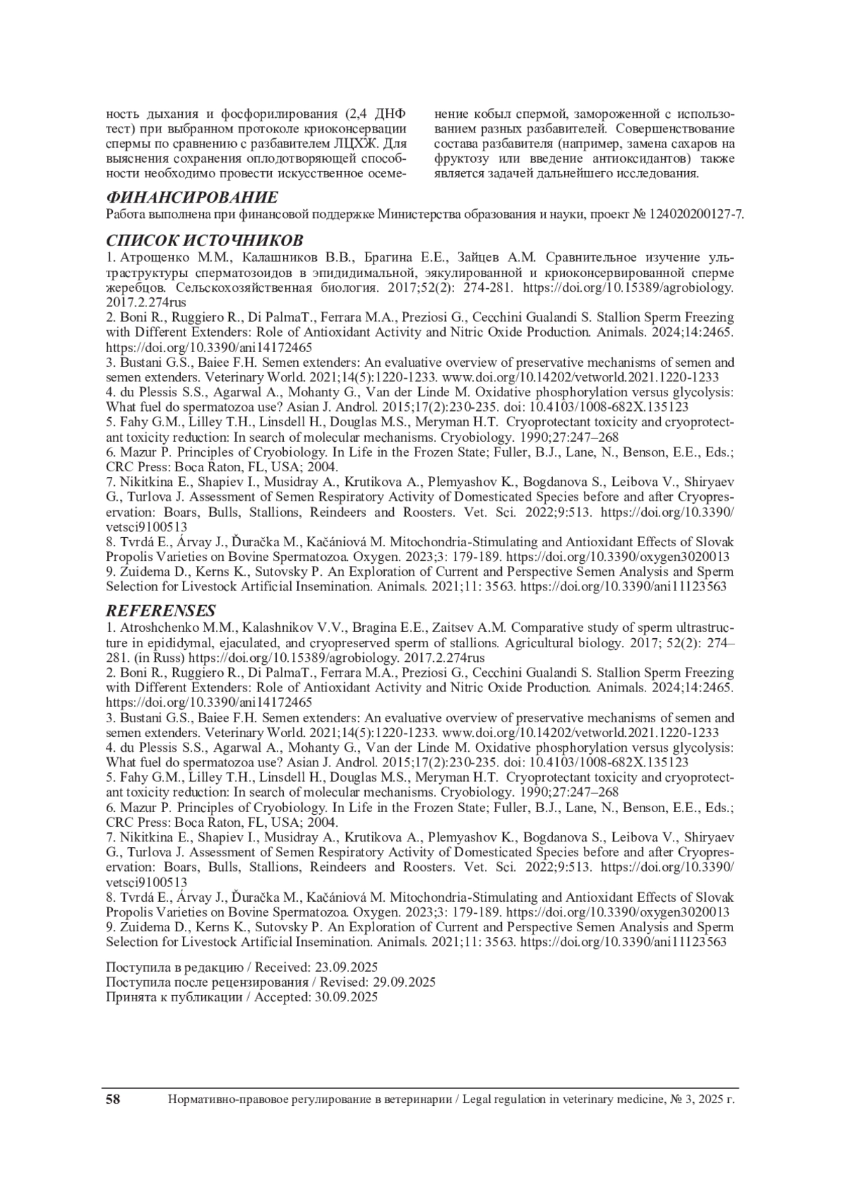 7. Nikitkina E., Shapiev I., Musidray A., Krutikova A., Plemyashov K., Bogdanova S., Leibova V., Shiryaev G., Turlova J. Assessment of Semen Respiratory Activity of Domesticated Species before and after Cryopres-ervation: Boars, Bulls, Stallions, Reindeers and Roosters. Vet. Sci. 2022;9:513. DOI: 10.3390/vetsci9100513
