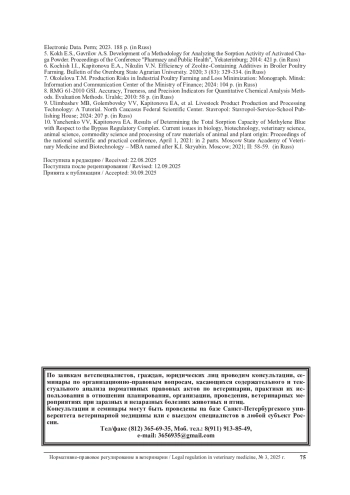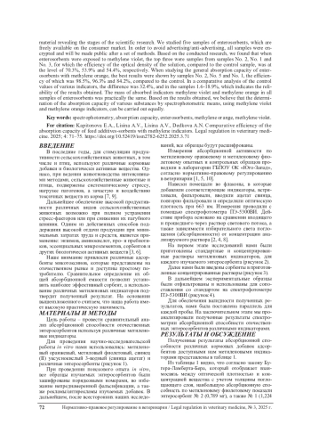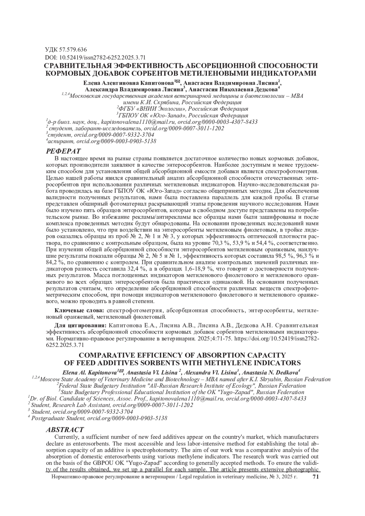 КАПИТОНОВА Е. А., ЛИСИНА А. В., ЛИСИНА А. В., ДЕДКОВА А. Н. СРАВНИТЕЛЬНАЯ ЭФФЕКТИВНОСТЬ АБСОРБЦИОННОЙ СПОСОБНОСТИ КОРМОВЫХ ДОБАВОК СОРБЕНТОВ МЕТИЛЕНОВЫМИ ИНДИКАТОРАМИ // НОРМАТИВНО-ПРАВОВОЕ РЕГУЛИРОВАНИЕ В ВЕТЕРИНАРИИ. 2025. № 3