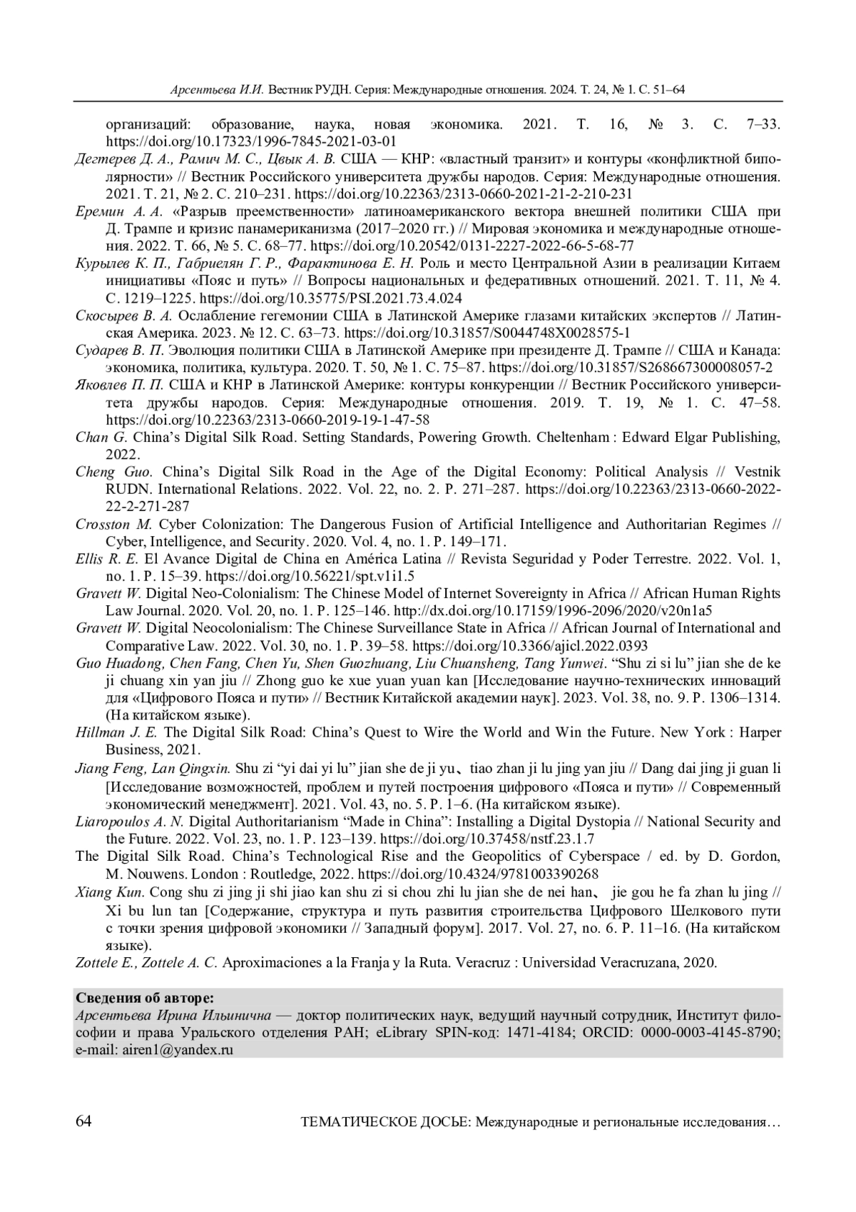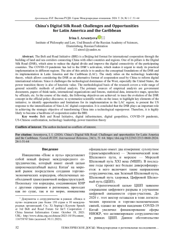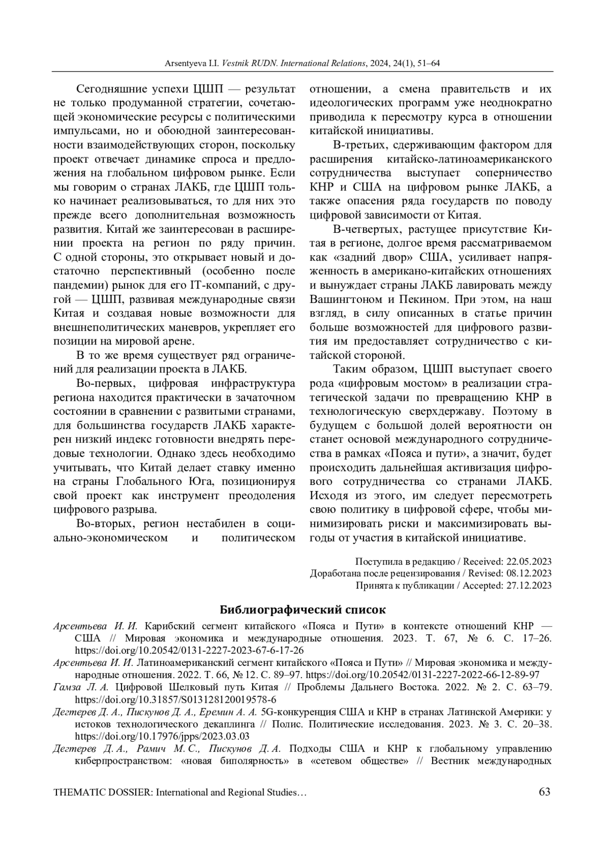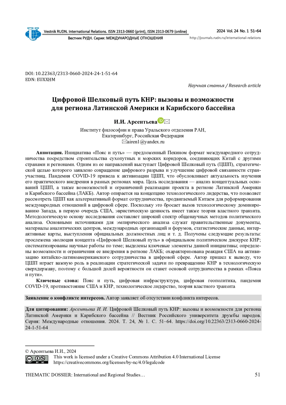 АРСЕНТЬЕВА И. И. ЦИФРОВОЙ ШЕЛКОВЫЙ ПУТЬ КНР: ВЫЗОВЫ И ВОЗМОЖНОСТИ ДЛЯ РЕГИОНА ЛАТИНСКОЙ АМЕРИКИ И КАРИБСКОГО БАССЕЙНА // ВЕСТНИК РОССИЙСКОГО УНИВЕРСИТЕТА ДРУЖБЫ НАРОДОВ. СЕРИЯ: МЕЖДУНАРОДНЫЕ ОТНОШЕНИЯ. 2024. ТОМ 24 № 1