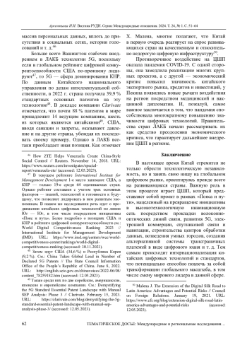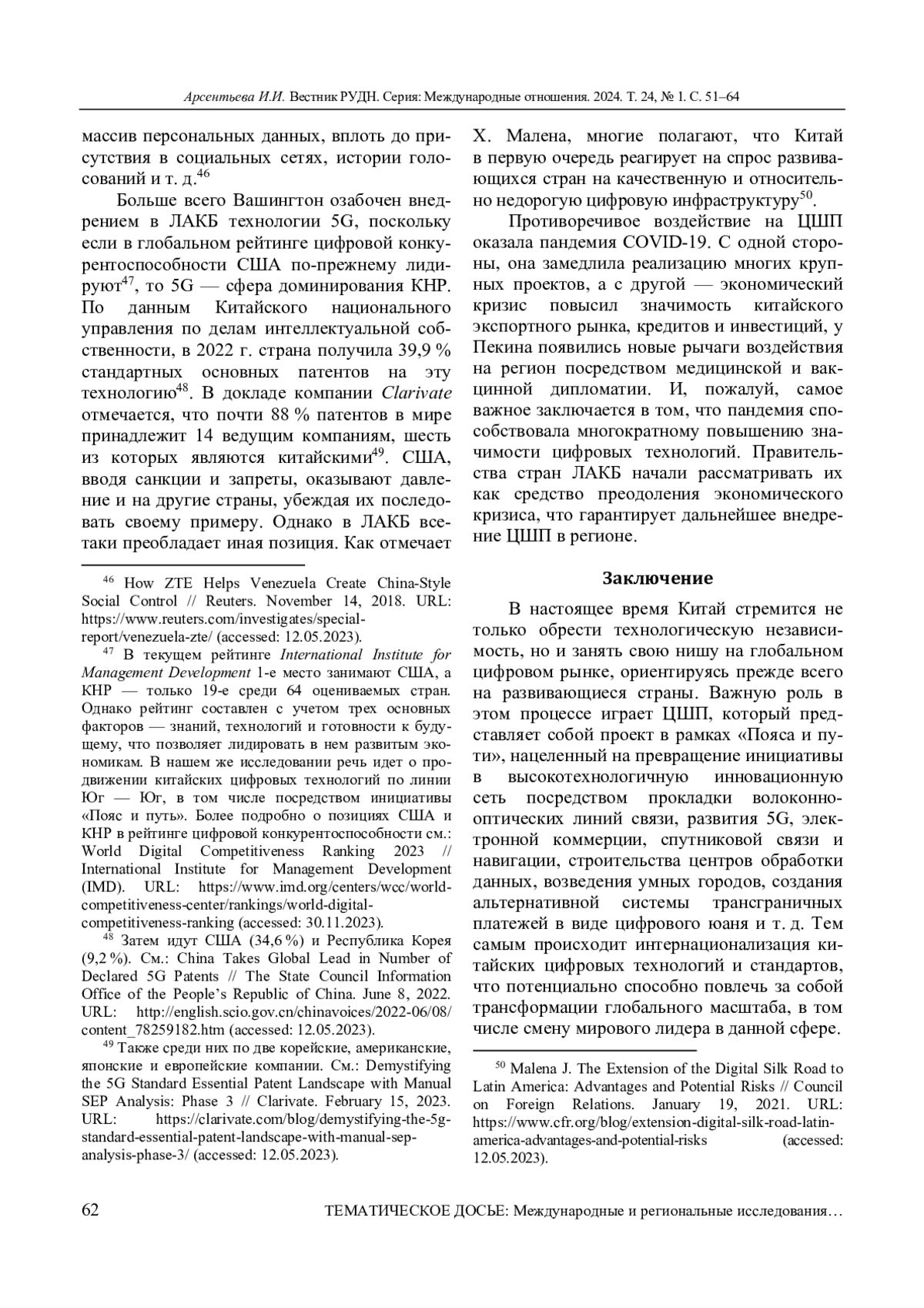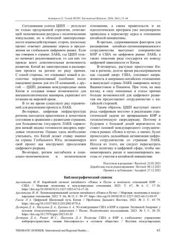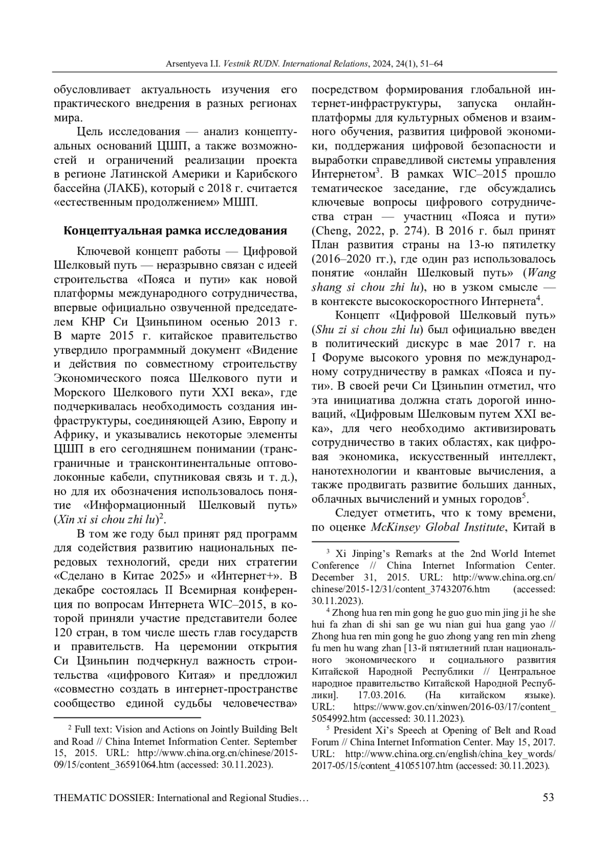 АРСЕНТЬЕВА И. И. ЦИФРОВОЙ ШЕЛКОВЫЙ ПУТЬ КНР: ВЫЗОВЫ И ВОЗМОЖНОСТИ ДЛЯ РЕГИОНА ЛАТИНСКОЙ АМЕРИКИ И КАРИБСКОГО БАССЕЙНА // ВЕСТНИК РОССИЙСКОГО УНИВЕРСИТЕТА ДРУЖБЫ НАРОДОВ. СЕРИЯ: МЕЖДУНАРОДНЫЕ ОТНОШЕНИЯ. 2024. ТОМ 24 № 1