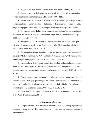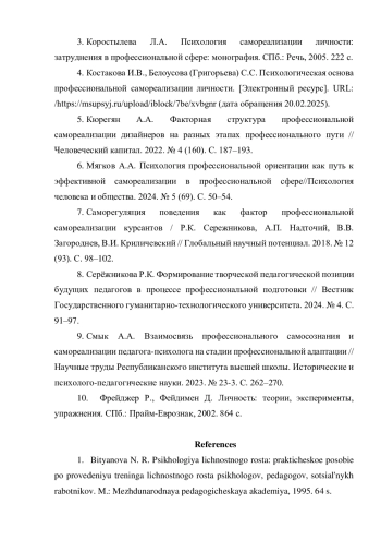 4. Костакова И.В., Белоусова (Григорьева) С.С. Психологическая основа профессиональной самореализации личности. [Электронный ресурс]. URL: /https://msupsyj.ru/upload/iblock/7be/xvbgnr(датаобращения20.02.2025).