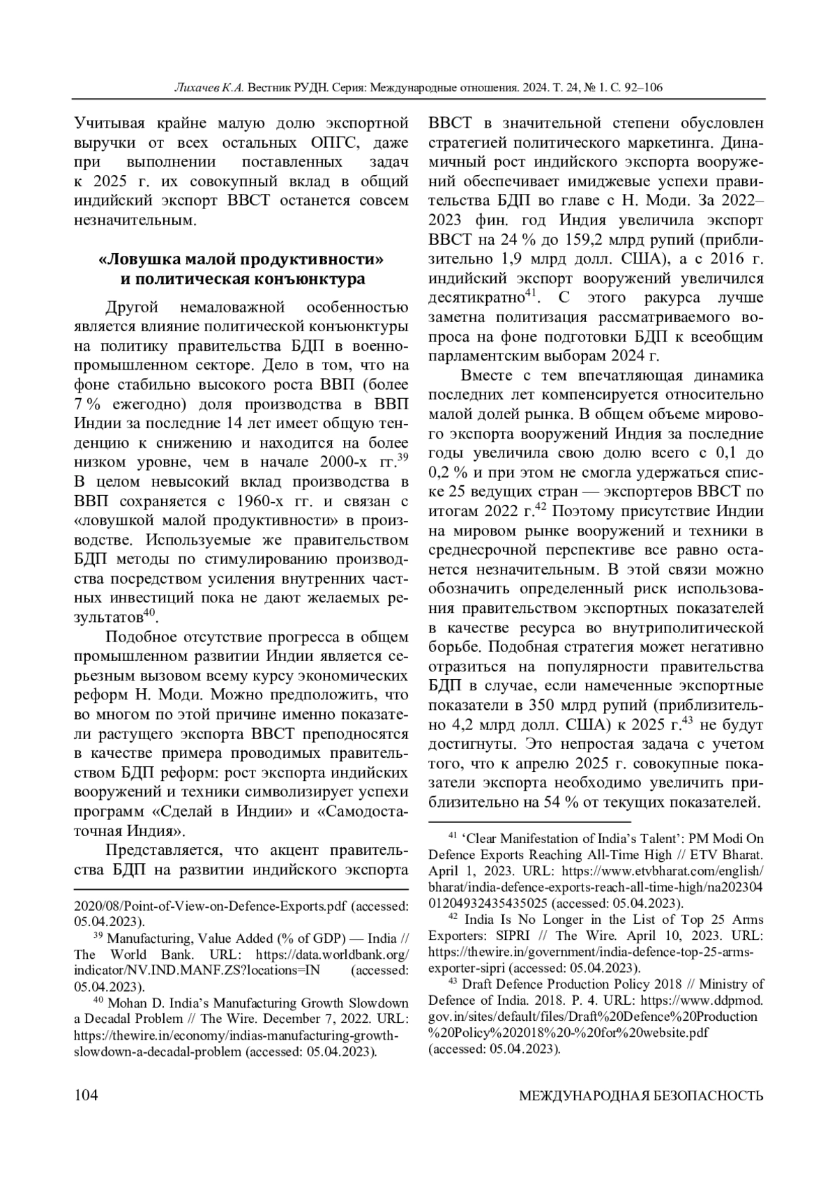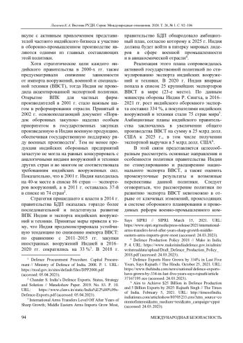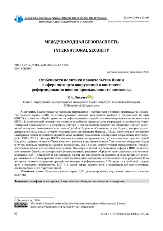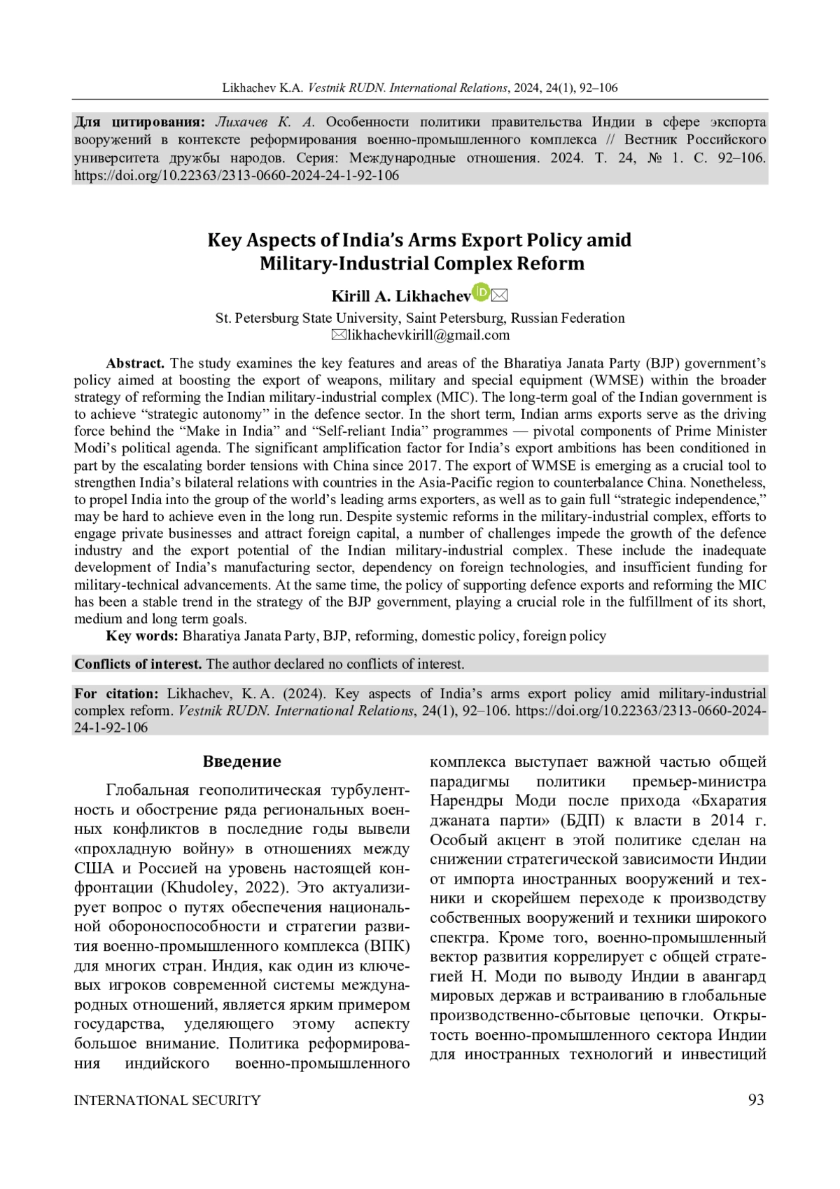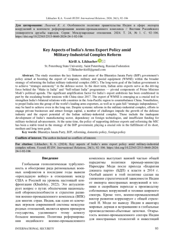 ЛИХАЧЕВ К. А. ОСОБЕННОСТИ ПОЛИТИКИ ПРАВИТЕЛЬСТВА ИНДИИ В СФЕРЕ ЭКСПОРТА ВООРУЖЕНИЙ В КОНТЕКСТЕ РЕФОРМИРОВАНИЯ ВОЕННО-ПРОМЫШЛЕННОГО КОМПЛЕКСА // ВЕСТНИК РОССИЙСКОГО УНИВЕРСИТЕТА ДРУЖБЫ НАРОДОВ. СЕРИЯ: МЕЖДУНАРОДНЫЕ ОТНОШЕНИЯ. 2024. ТОМ 24 № 1