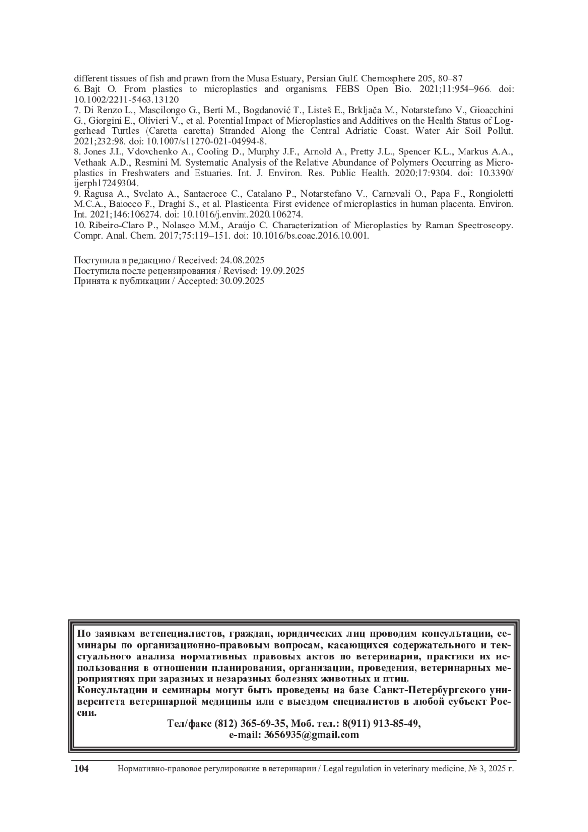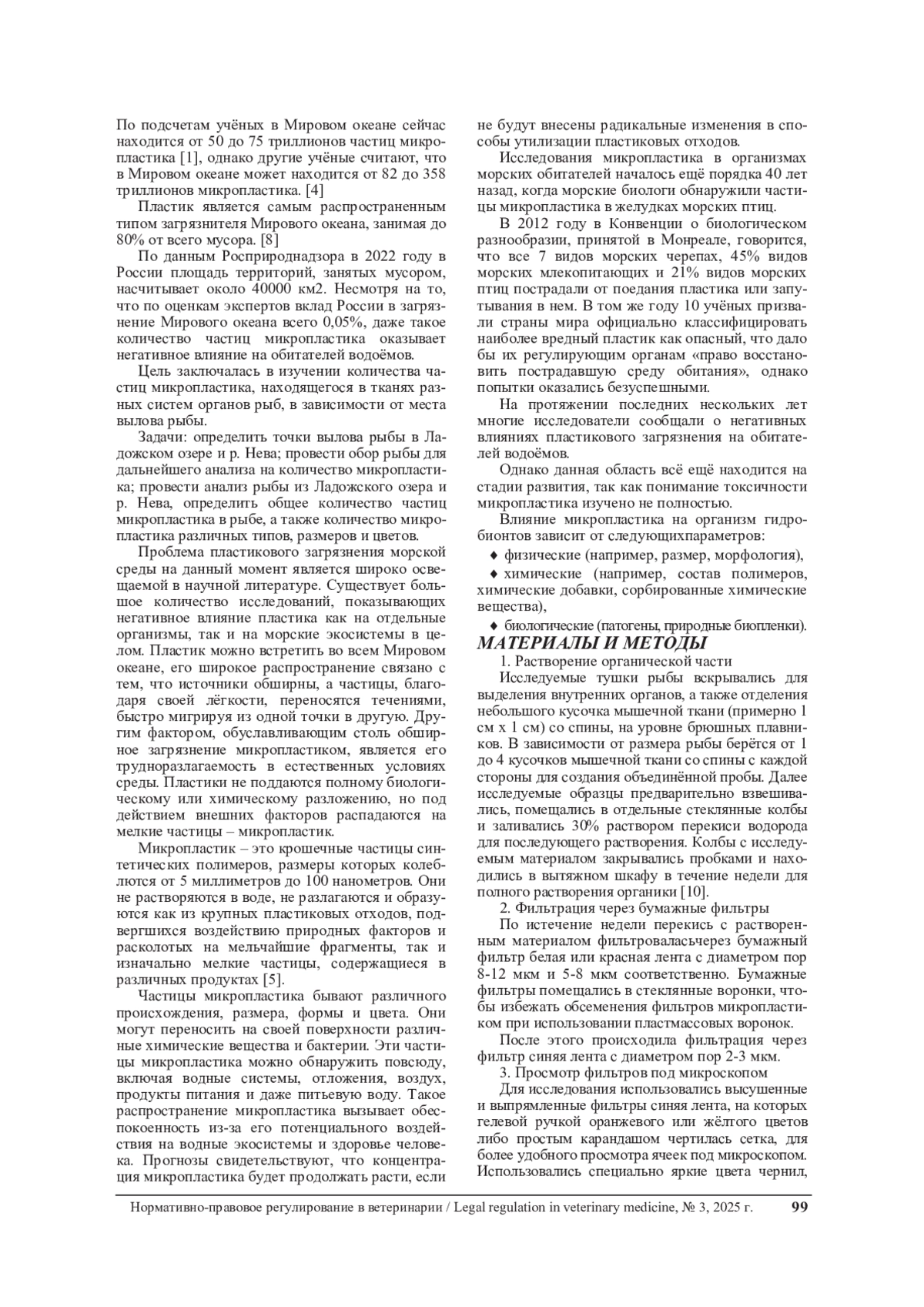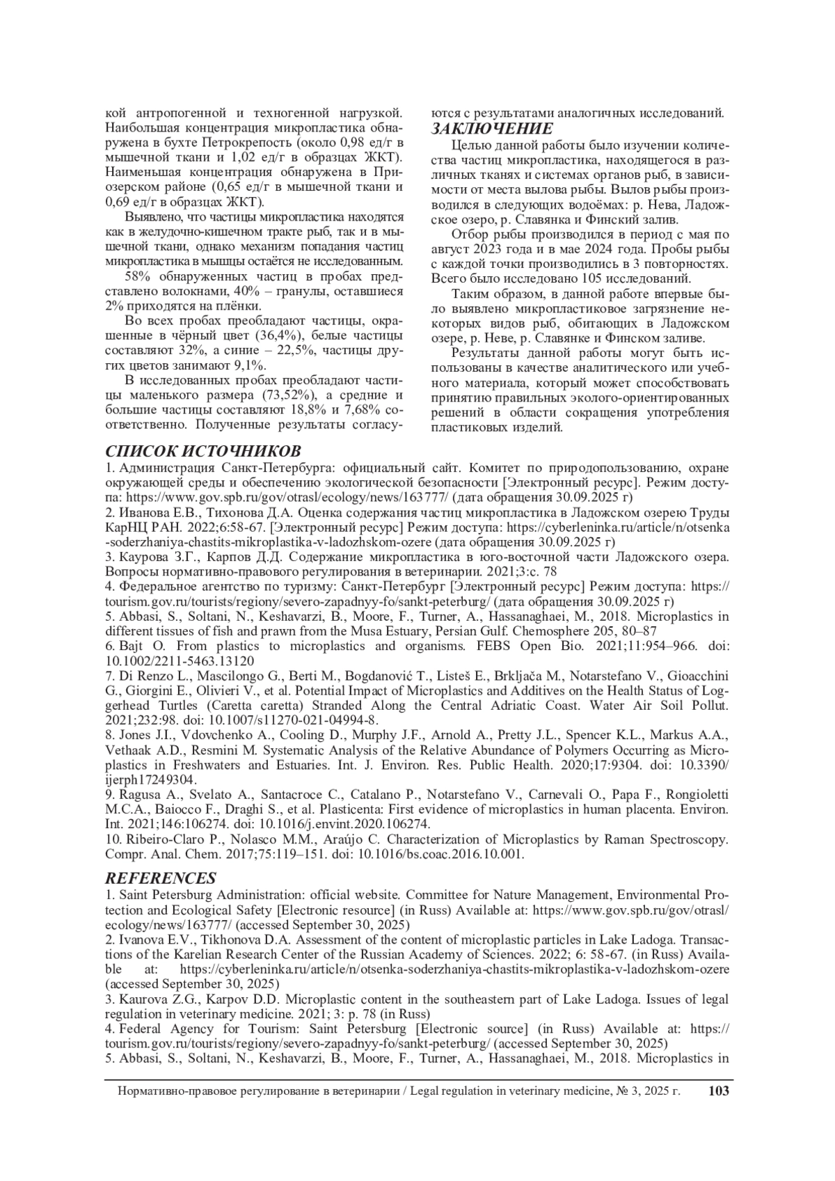 3. Каурова З.Г., Карпов Д.Д. Содержание микропластика в юго-восточной части Ладожского озера. Вопросы нормативно-правового регулирования в ветеринарии. 2021;3:c. 78.