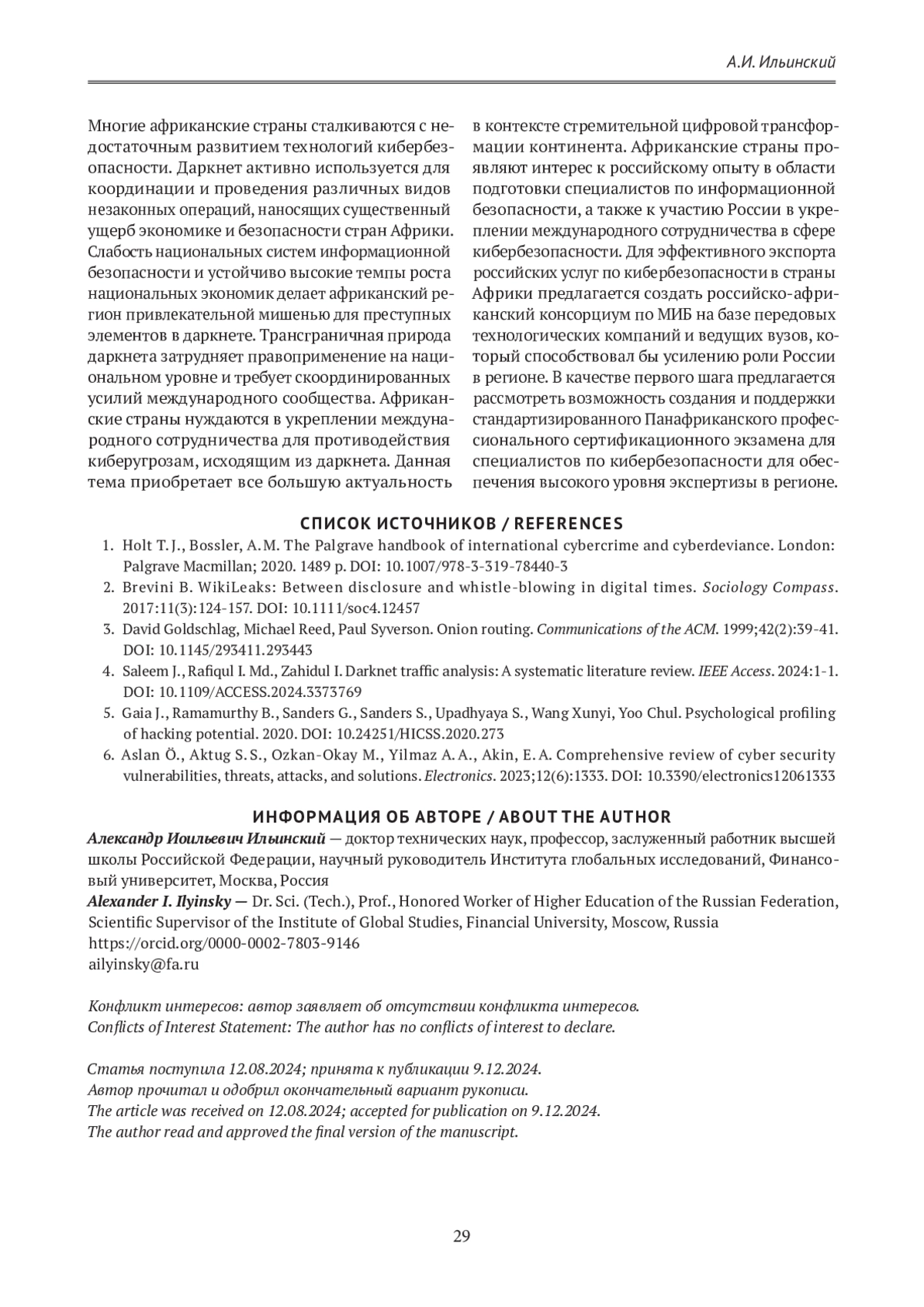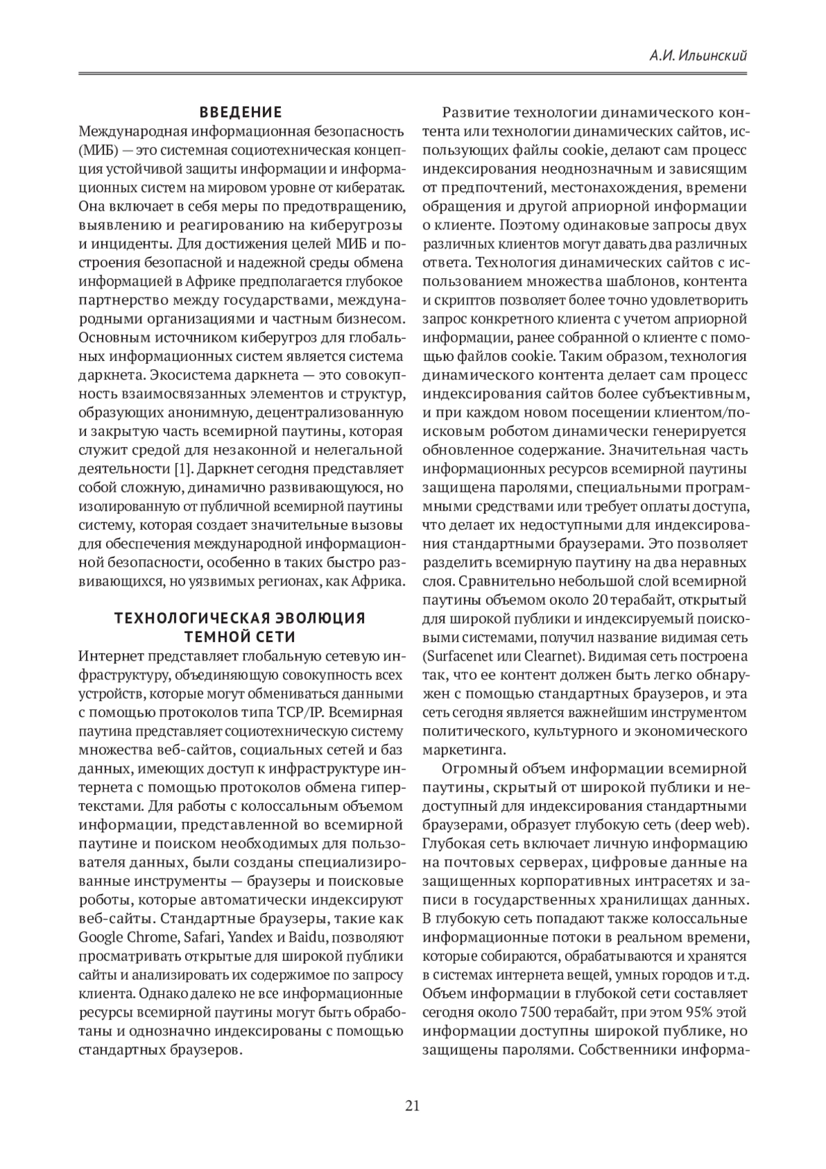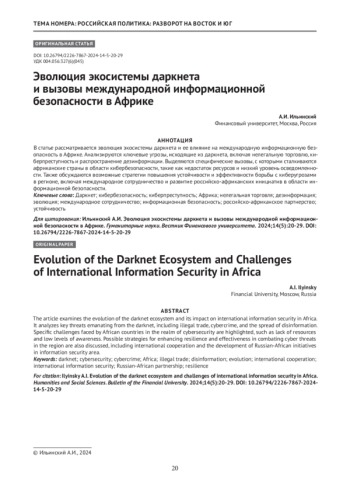 ИЛЬИНСКИЙ А. И. ЭВОЛЮЦИЯ ЭКОСИСТЕМЫ ДАРКНЕТА И ВЫЗОВЫ МЕЖДУНАРОДНОЙ ИНФОРМАЦИОННОЙ БЕЗОПАСНОСТИ В АФРИКЕ // ГУМАНИТАРНЫЕ НАУКИ. ВЕСТНИК ФИНАНСОВОГО УНИВЕРСИТЕТА