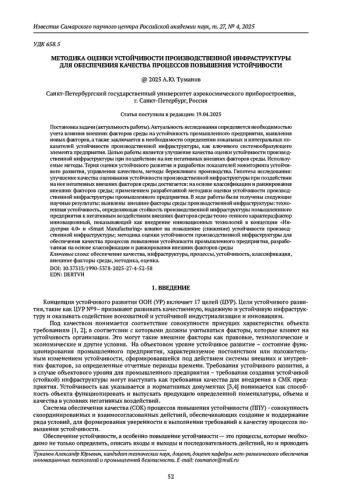 Постановка задачи (актуальность работы). Актуальность исследования определяется необходимостью учета влияния внешних факторов среды на устойчивость промышленного предприятия, выявления новых факторов, а также заключается в необходимости определении локальных и интегральных показателей устойчивости производственной инфраструктуры, как ключевого системообразующего элемента предприятия. Целью работы является улучшение качества оценки устойчивости производственной инфраструктуры при поздействии на нее негативных внешних факторов среды. Используемые методы. Терия оценки устойчивого развития и разработки показателей мониторинга устойчивого развития, управления качеством, методы бережливого производства. Гипотеза исследования: улучшение качества оценивания устойчивости производственной инфраструктуры при поздействии на нее негативных внешних факторов среды достигается: на основе классификации и ранжирования внешних факторов среды; применением разработанной методики оценки устойчивости производственной инфраструктуры промышленного предприятия. В ходе работы были получены следующие научные результаты: выявлены внешние факторы среды производственной инфраструктуры: техногенная устойчивость, определяющая стойкость производственной инфраструктуры помышленнного предприятия к негативным воздействиям внешних факторов среды техно-генного характера; фактор инновационный, показывающий как внедрение инновационных технологий в концепции «Индустрия 4.0» и «Smart Manufacturing» влияют на повышение (снижение) устойчивости производственной инфраструктуры; методика оценки устойчивости производственной инфраструктуры для обеспечения качества процессов повышения устойчивости промышленного предприятия, разработанная на основе классификации и ранжирования внешних факторов среды