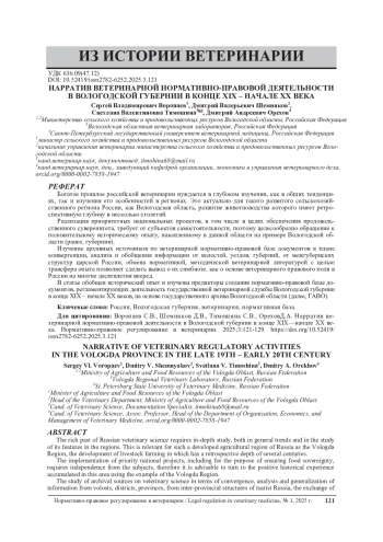 Богатое прошлое российской ветеринарии нуждается в глубоком изучении, как в общих тенденциях, так и изучения его особенностей в регионах. Это актуально для такого развитого сельскохозяйственного региона России, как Вологодская область, развитие животноводства которого имеет ретроспективную глубину в несколько столетий.