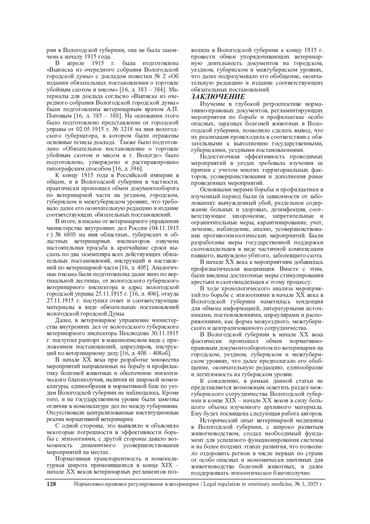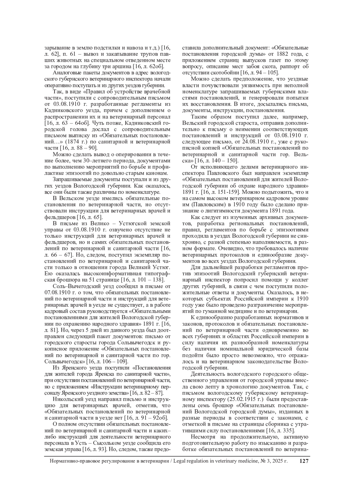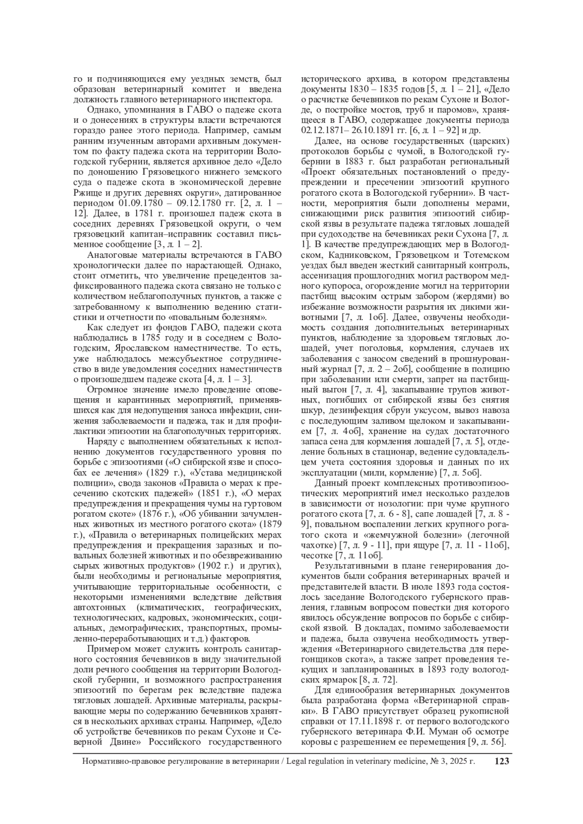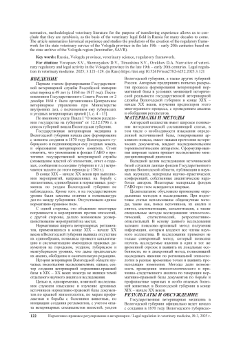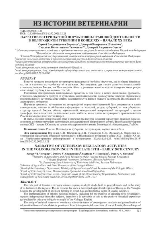 В статье обобщен исторический опыт и изучены предикторы создания нормативно-правовой базы документов, регламентирующих деятельность государственной ветеринарной службы Вологодской губернии в конце XIX - начале ХХ веков, на основе государственного архива Вологодской области (далее, ГАВО).